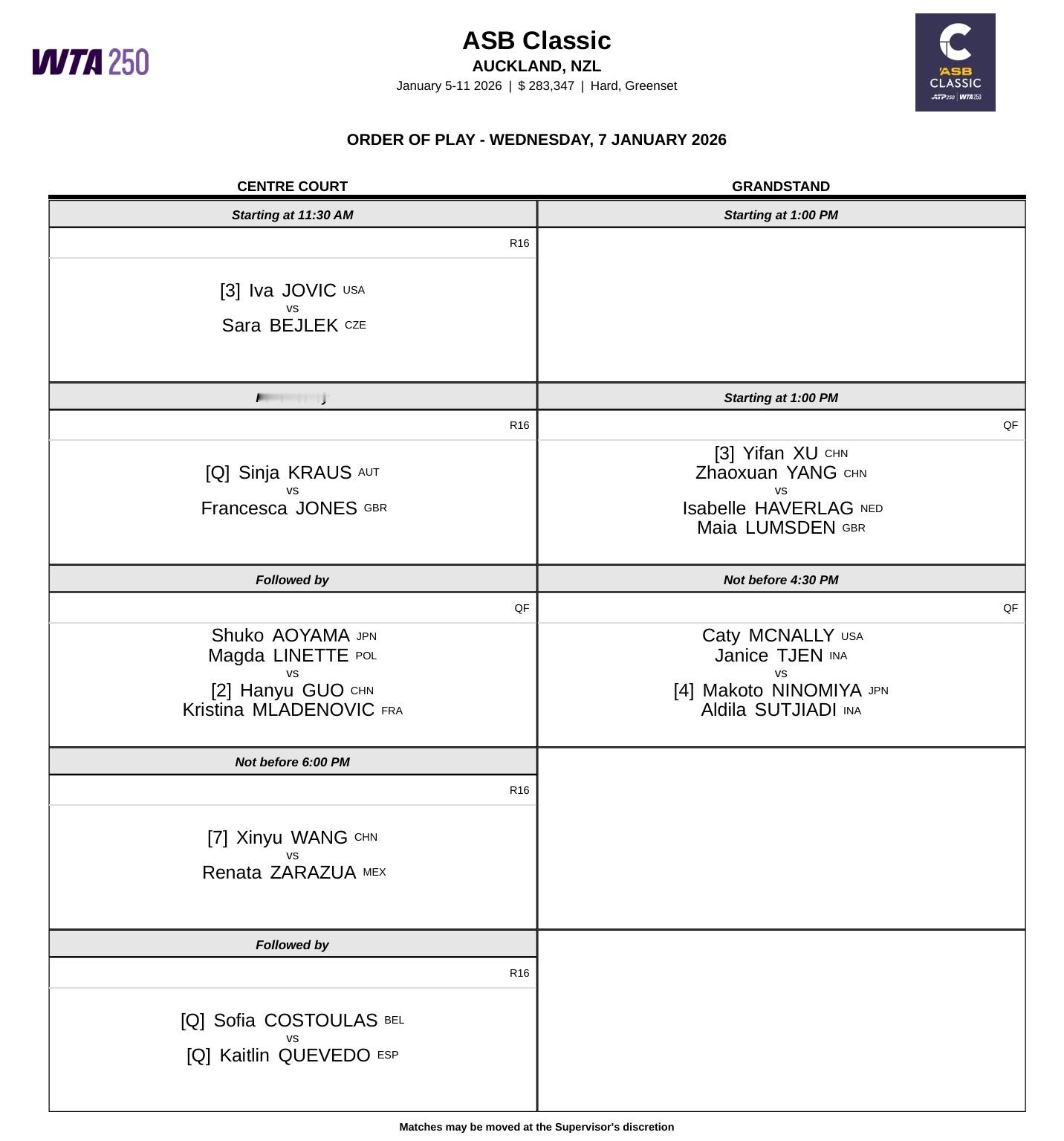 周三赛程📅布里斯班站阿尼西莫娃、佩古拉、米拉·安德列娃出战,奥克兰站王欣瑜冲击八强。以下安排均为北京时间👇🎾WTA500布里斯班站📍帕特·拉夫特球场9:00 - 卡林斯卡娅 vs 佩古拉不早于16:30 - [W]比勒尔 vs 阿尼西莫娃📍1号场不早于10:30 - [W]琼斯 vs [10]萨姆索诺娃随后 - 弗莱彻 vs 诺斯科娃随后 - 米拉·安德列娃 vs [Q]盖德基📍2号场9:00 - [13]费尔南德斯 vs 雅斯特雷姆斯卡随后 - 陶森 vs [Q]萨斯诺维奇不早于12:00 - 巴多萨/萨巴伦卡 vs 布克沙/佩雷兹随后 - 谢淑薇/奥斯塔彭科 vs [W]韩天遇/穆霍娃随后 - [16]科斯秋克 vs [L]普丁塞娃🎾WTA250奥克兰站📍中心场6:30 - 约维奇 vs 贝莱克随后 - [Q]克劳斯 vs 琼斯随后 - 青山修子/里内特 vs 郭涵煜/穆拉德诺维奇不早于13:00 - 王欣瑜 vs 扎拉祖阿随后 - [Q]克斯特拉斯 vs [Q]克韦多📍大看台号场8:00 - 徐一璠/杨钊煊 vs 哈弗拉格/卢姆斯登