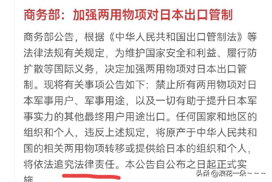 太突然了吧?! 就在刚刚,看到了商务部的一个公告:加强两用物项对日本出口管制。