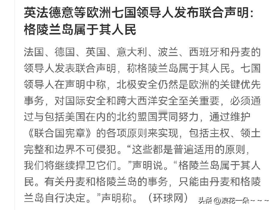 快讯!快讯! 欧洲坐不住了吗?就在刚刚,英法德意等欧洲七国领导人发布联合声明:格陵兰岛属于其人民。 看来格陵兰岛的事,不但是丹麦政府压力大,欧洲压力也不小啊,特朗普政府现在对格林兰岛已经是虎视眈眈,因为特朗普政府内部已经形成了共识,要拿下格林兰岛,就连白宫办公厅副主任米勒采访时都说“拒绝排除武力夺取格陵兰岛的可能性”,意思就是说武力夺岛也是一个选项,不能排除。 所以说,丹麦首相也害怕,她就说了如果美国武力夺取格陵兰岛,那么北约体系将会终结。再联想到今天的新闻报道说,美国现在出动了很多战机到欧洲。就美国这态势,欧洲国家能坐得住吗?肯定也睡不好觉啊。 所以说,赶紧发表一个声明,告诉美国,欧洲主要国家也挺在意格陵兰岛这事情的,不要不把欧洲不放在眼里。特朗普政府,你们听到了吗?格陵兰岛属于其人民,要想夺取格陵兰岛先问问欧洲答不答应,把后果考虑清楚了。