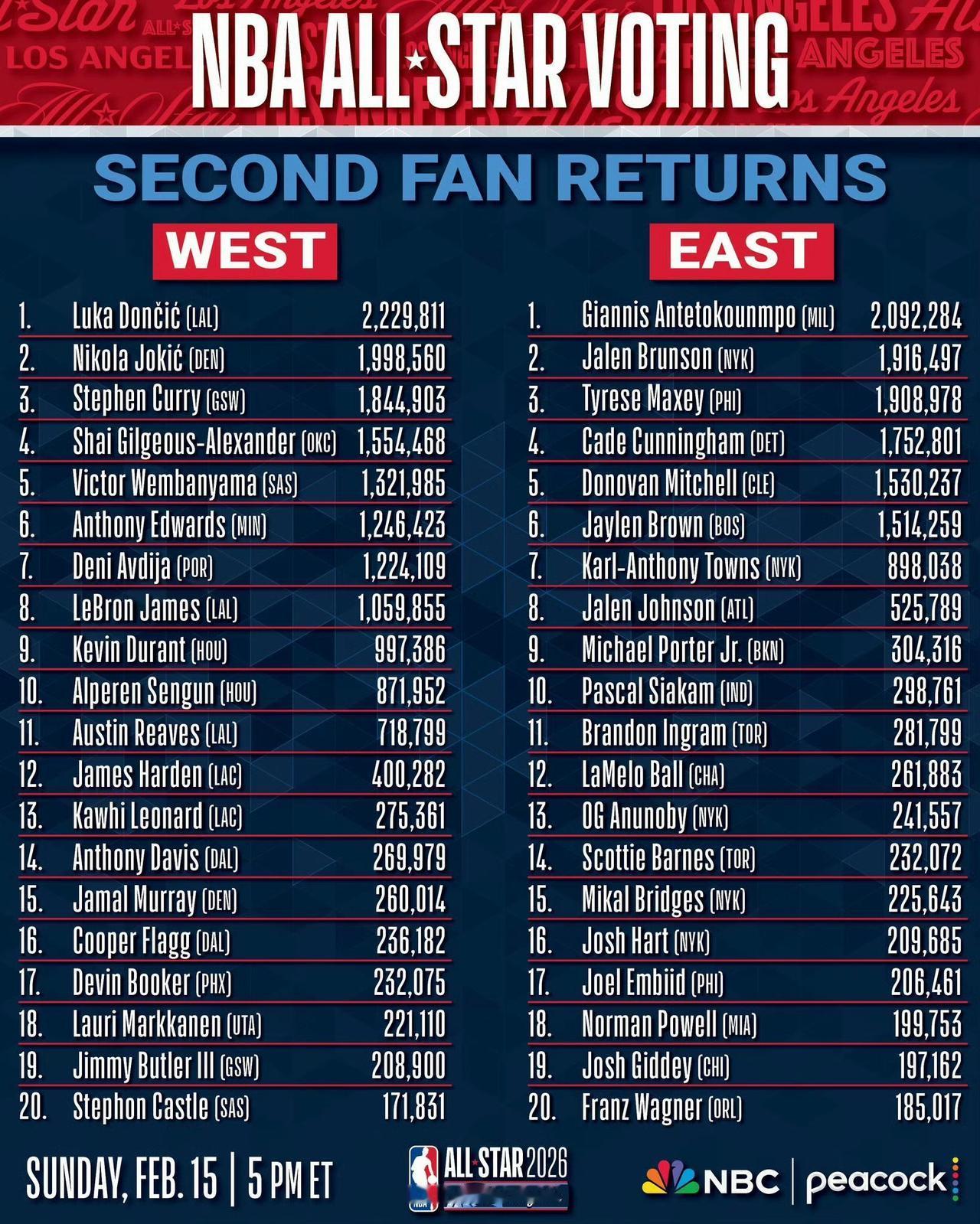 NBA全明星球迷投票第二轮结果,东契奇联盟票王,字母哥东部第一,詹姆斯西部第八,杜兰特西部第九。 曾经的大小王人气这么少?詹姆斯过气了,杜兰特不应该啊。