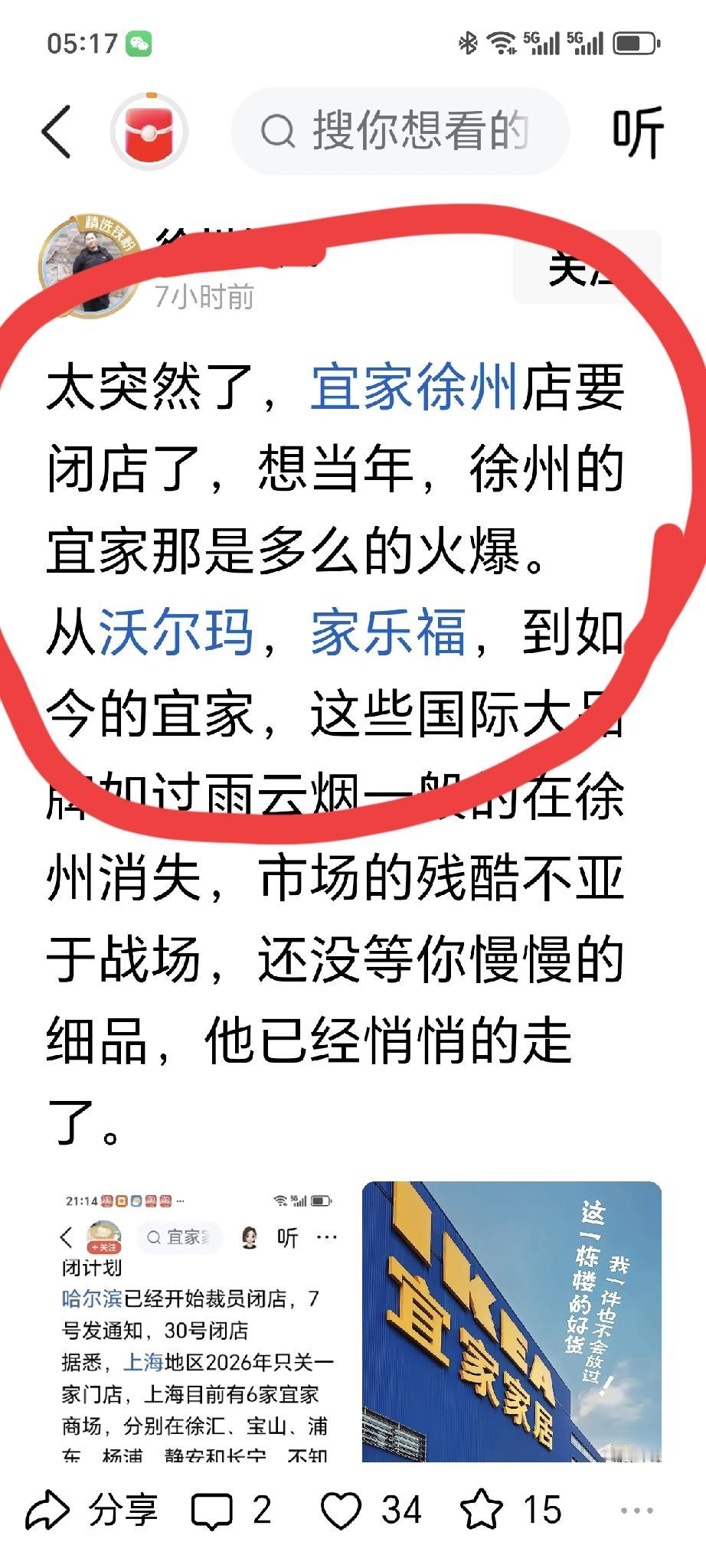 城市 宜家 勿造谣,勿为博眼球传播假消息。近期网络流传“宜家7城闭店”的说法,涉及徐州、哈尔滨等地,连上海5家宜家今年也要关闭一家的,不过这些均是非官方消息,纯民间传说。 从宜家中国官网可知,徐州商场正常营业,营业时间为10:00 - 20:00,且未发布闭店通知;宜家中国也未官宣过徐州店的关闭计划。 有人说以前的沃尔玛、家乐福撤离徐州,如今又传宜家也要远离徐州,仿佛国际知名商业品牌在徐州难以立足。老徐还打算引入山姆会员店,看样子短期内难以实现了。 宜家家居 哈尔滨