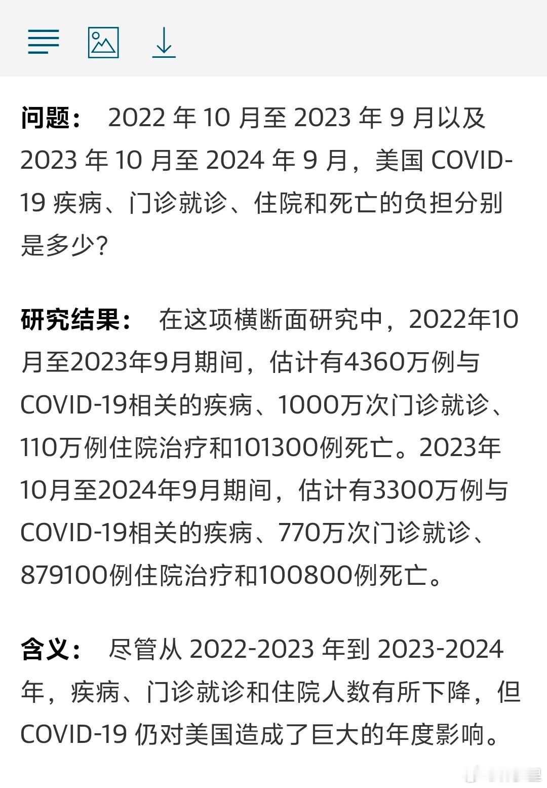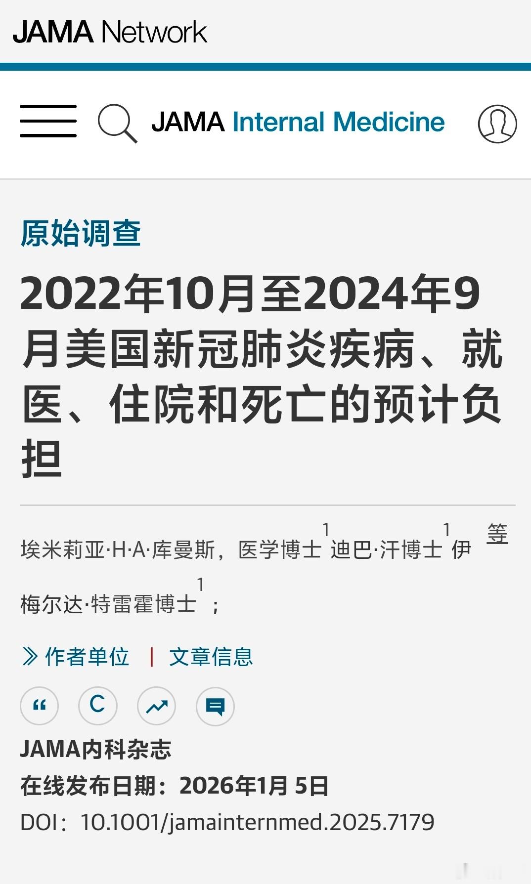 美国CDC,2026年1月5日在《美国医学会杂志》上发表的一项新研究:2022年10月至2024年9月美国新冠疾病、就医、住院和死亡的预计负担。结果表明:✨新冠仍在导致大量美国人死亡,,2022年至2024年间,每年新冠死亡人数超过10万。尽管公卫紧急状态已经结束,但新冠仍对美国造成巨大的年度影响。参考:网页链接