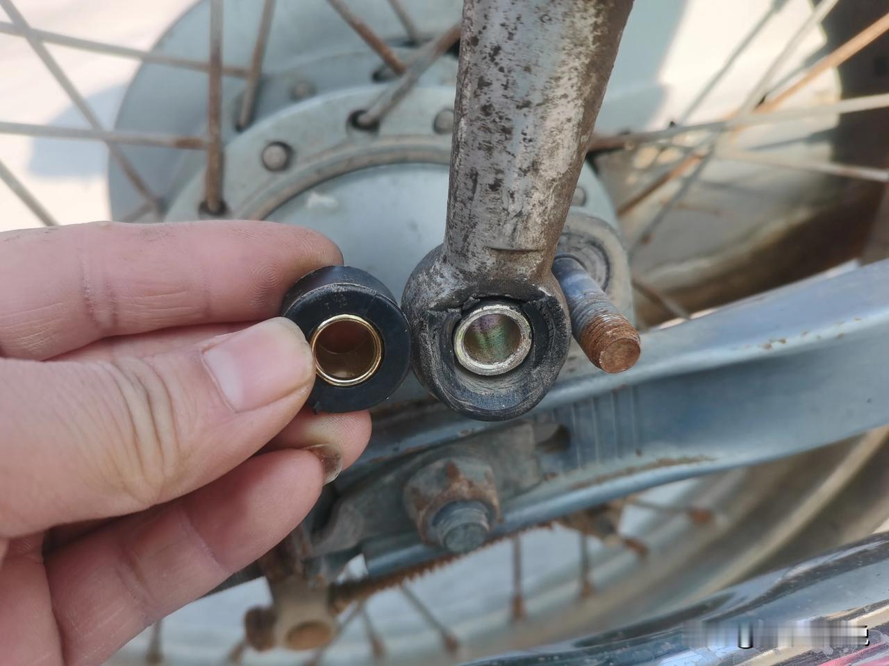 突然发现摩托车带人的时候只要路面不平整,后轮竟然会蹭到挡泥板。一检查发现减震器缓冲胶套都破烂成这样了,先换掉试试效果。 其实汽车也一样,底盘悬挂上也有很多这种胶套,一但老化损坏,底盘就会变得松散。