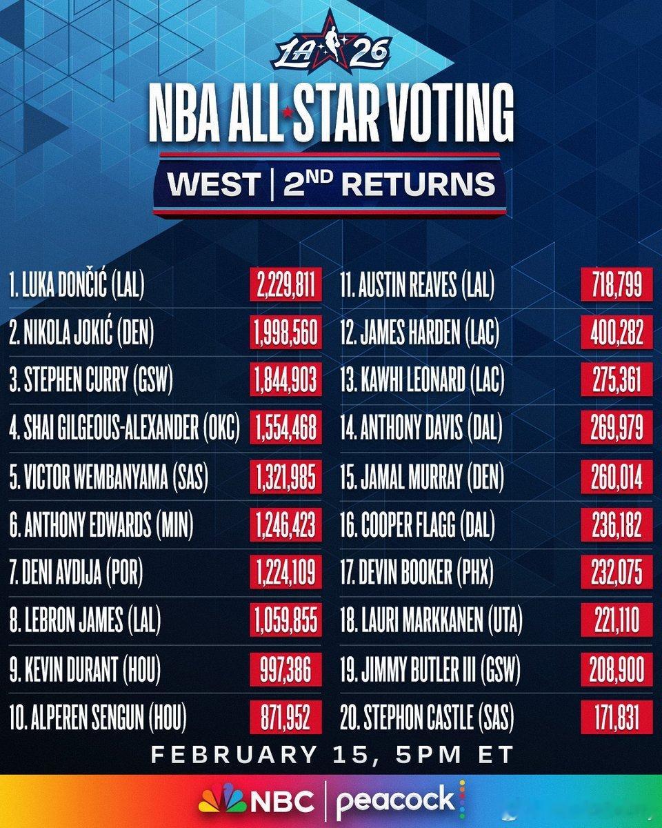 NBA官方公布第二轮投票结果。东契奇票王,字母哥领跑东部,库里仍然稳居西部第三,吉米巴特勒入选西部前二十,詹姆斯落后阿夫迪亚。西部前十:东契奇、约基奇、库里、亚历山大、文班亚马、爱德华兹、阿夫迪亚、詹姆斯、杜兰特、申京。东部前十:阿德托昆博、布伦森、马克西、坎宁安、米切尔、杰伦布朗、唐斯、杰伦约翰逊、小迈克尔波特、西亚卡姆。nba全明星第二轮投票结果