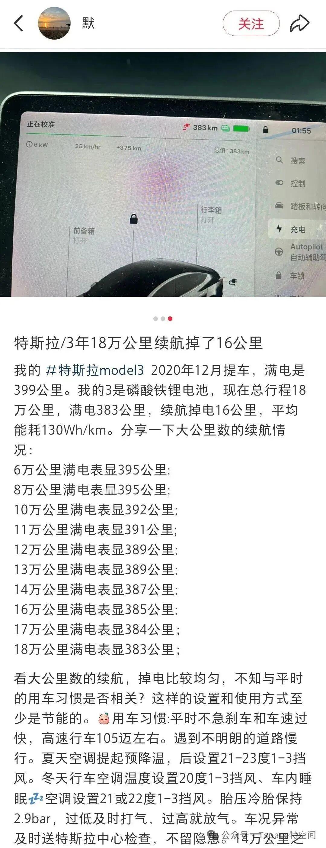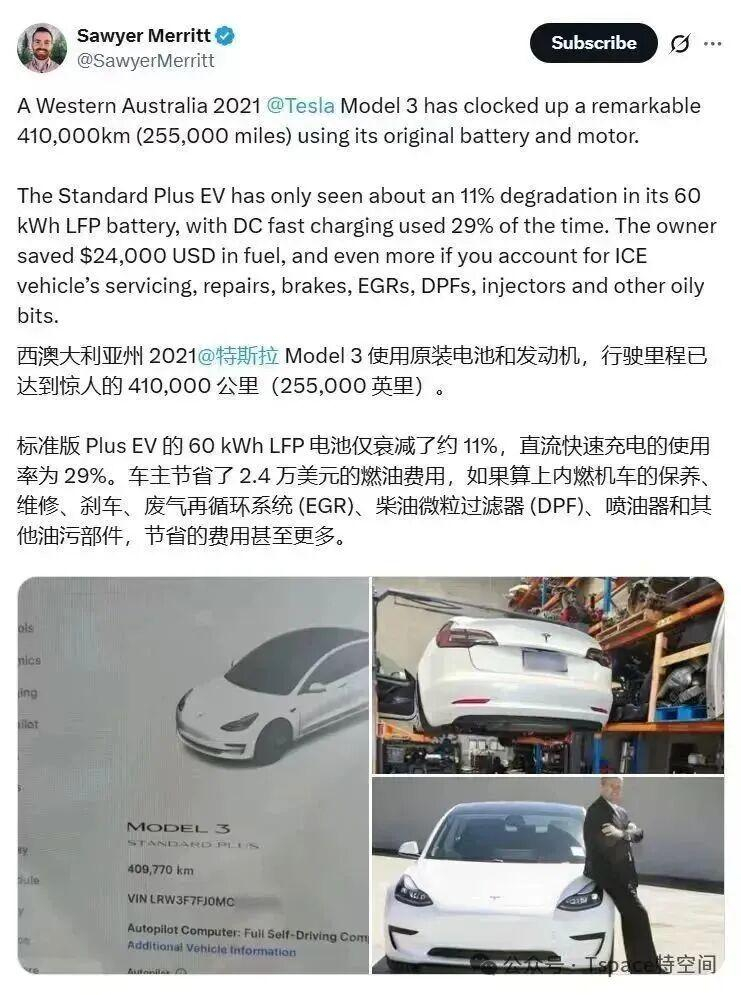 Model 3创电动车原装电池行驶里程世界纪录,连刹车片都不用换据外媒报道,意大利出租车公司Taxi Desio运营使用的一台Model 3高性能版车型,在长达6年半的时间里行驶里程高达60万公里,电池、电机均为原装,车辆状况依旧能打。媒体在报道中表示:“特斯拉创下了电动车原装电池行驶里程的世界纪录。”作为一辆高强度使用的运营车辆,这台特斯拉截至目前维护费用仅为3500欧元(约2.73万人民币)。除了更换一些必要的易损件和小零件外,甚至连刹车片都是原装的。不少车主在真实用车经历中,都对特斯拉出色能打的三电实力深有体会。Model 3车主默也观察了爱车使用三年后的电池表现,在行驶18万公里后电池容量仍高达约96%,且始终保持稳定健康的状态,平均能耗约为13kW·h/100km。在海外博主Sawyer Merritt 分享的一位Model 3车主的真实用车经历中,在使用原装电池和电机的情况下,车辆已累计行驶41万公里,电池容量仅衰减约11%。车主表示,其中29%的时间是通过使用特斯拉直流快充完成的充电。特斯拉可靠耐用的产品质量,让车主感叹不仅“真香”还“真省”!他表示:“比起传统燃油车,光补能费用就节省约2.4万美元(约合超17万人民币),这还不算燃油车定期保养、维修更换的额外支出。”特斯拉汽车变成快消品了吗特斯拉推出7年超低息购车