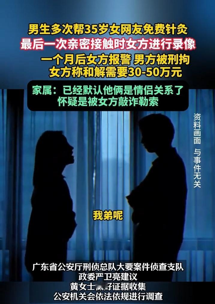 广东中医学生免费针灸女网友,竟因一段录像被刑拘!50万和解费是敲诈还是维权? 广东一名中医学生的善意,竟成了把自己送进看守所的“导火索”。他多次免费帮35岁女网友针灸,最后一次亲密接触时被对方偷偷录像,时隔一个月,女生报警让他刑拘,还狮子大开口要30-50万和解费!家属直言两人是情侣,这出反转大戏到底藏着多少猫腻? 据当事人姐姐黄女士讲述,弟弟是学医的学生,出于好心为女网友提供免费针灸服务,两人往来日久,家属都默认了他们的情侣关系。可谁能想到,最后一次相处的亲密瞬间,被女方悄悄录了像。 一个月后,这份录像突然变成“关键证据”,女方直接报警,男生当场被刑拘。紧接着,女方抛出和解条件:拿30到50万来,这事才算完。一个还在上学的学生,根本拿不出这笔巨款,家属坚信,这不是简单的情感纠纷,而是女方精心设计的敲诈勒索。 一边是学生家属喊冤,称弟弟是善意相助反遭算计;另一边是女方手握录像报警,索要高额和解费。有人质疑女方是“设局碰瓷”,利用亲密录像进行敲诈;也有人认为,亲密关系的界定不能只看家属说法,或许还有不为人知的细节。 这件事也给所有人敲响警钟:网络交友需谨慎,哪怕是善意的帮助,也要守住边界感,避免因一时疏忽陷入被动。而这起事件的真相,究竟是女方的敲诈勒索,还是另有隐情?唯有等待警方的进一步调查。 你觉得这起事件中,谁的说法更可信?欢迎在评论区留下你的观点!