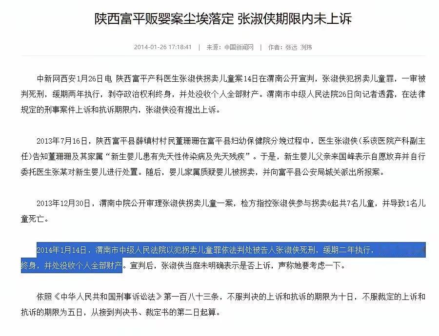 2014年,陕西一家医院的产科主任张淑侠,因贩卖26名婴儿被判处死刑。直到最后,