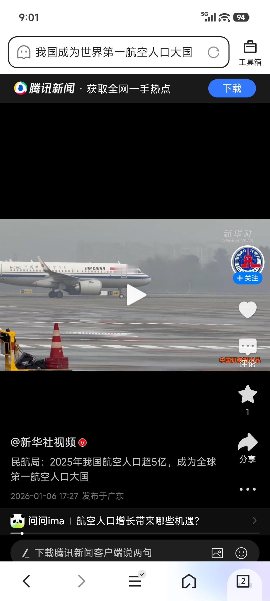 2025年我国成了全球第一航空人口大国,航空总人口超5亿,太牛了!这一年,民航运输数据超亮眼,运输总周转量、旅客运输量、货邮运输量同比分别增长10.5%、5.5%、13.3%,国际航班恢复至2019年90%以上。 “十四五”期间,民航固定资产投资达6300亿,新增跑道、机位、航站楼面积超多,运输机场达270个,机队规模达4574架。而且国产航空产品也崛起了,C919、AG600完成适航审定,运输机队里国产飞机有220架。咱国家航空发展一路高歌猛进,未来肯定更厉害!