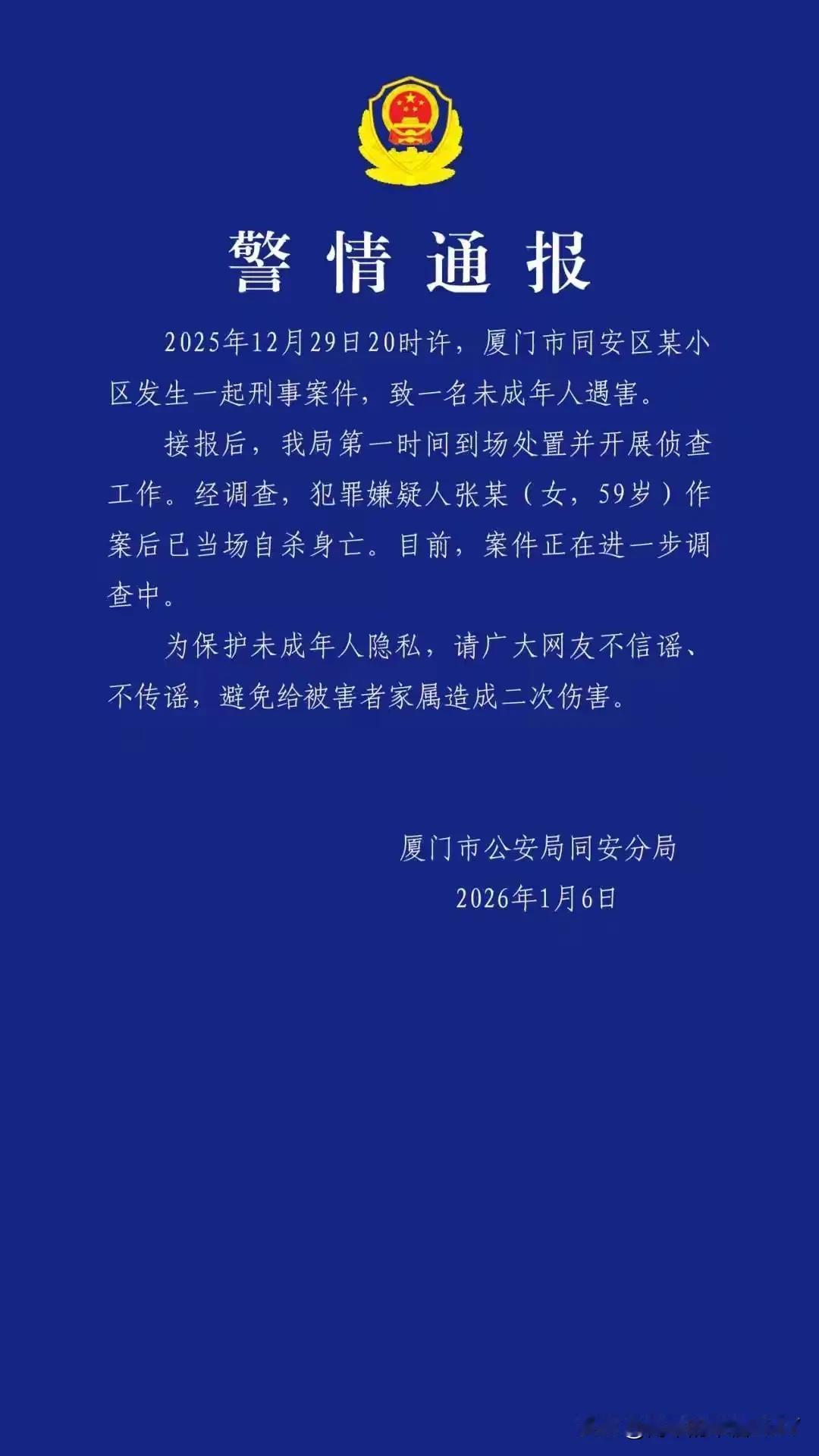 厦门5岁男童遇害后续!59岁凶手跳楼自尽,知情人曝冲突隐情。真的要被气死了,好好的一个5岁娃,下楼骑个自行车,就半小时没看住,居然没了! 12月29号晚上,同安区的那个小区里,奶奶带着孩子下楼玩。平时看着挺安生的地方,谁能想到藏着这样的恶?孩子妈妈后来回忆,找到娃的时候,浑身是伤,脖子后背全是刀痕,人当场就没了气息。 做母亲的,怕是心都被剜掉了一块。更让人气愤的是,59岁的凶手张某,干完这丧尽天良的事,直接从楼上跳了。一死了之,倒干净。可那孩子呢? 他才5岁,还没来得及看够这个世界,还没尝过多少甜头,就这么没了。小区楼管说,出事前见过这凶手跟孩子家人吵过架。知情人也念叨,双方之前就为孩子的事红过脸。 可孩子妈妈愣说“根本不认识他”,这就奇了,到底多大的怨气,能让一个人对毫无还手之力的孩子下死手?老话讲“冤有头债有主”,哪怕真有过节,冲着大人来啊。 跟一个5岁的娃较什么劲?这已经不是报复,是丧心病狂。凶手纵身一跃,倒是解脱了,可给孩子家留下的,是一辈子的窟窿。好好的家,就这么被碾碎了。 那孩子的小自行车,说不定还在楼下歪着,车把上挂着的小铃铛,再也等不到主人去摇响。他的小书包,明天该谁来收拾?他睡前听的故事,还没讲到结局呢。 有人说“凶手也死了,算是抵命了”。可这命怎么抵?一个作恶的生命,换一个无辜的生命,公平吗?孩子的父母,往后每个日夜,都得被这痛啃着,凶手却连一句道歉都没留下。 当家长的,看完这新闻,怕是夜里都睡不安稳。总觉得孩子离了视线就心慌,可谁能24小时把孩子拴在身上?坏人从不挑时候,他们藏在人群里。 可能就是那个擦肩而过的路人,那个楼下晒太阳的老头。 这小区里的邻居,怕是也吓得够呛。平时抬头不见低头见的,谁能想到身边藏着这样的狠角色? 往后再带孩子下楼,怕是眼睛都不敢眨一下。说到底,这世上最没道理的就是恶。它不管你是不是孩子,不管你有没有错,说发作就发作。我们能做的,除了把孩子看紧点,更得盼着这世上的恶能少点。 只是那家人,怕是再也盼不回他们的娃了。客厅里的小拖鞋,阳台上的小衣服,都会变成扎心的刺。凶手死了,可这账,永远也算不清了。 做父母的,都懂那种疼。孩子是心头肉,掉根头发都心疼。更别说这样的事,怕是一辈子都走不出来。只愿那孩子在天上能安好,也愿活着的人,能慢慢撑下去。 只是这世上的恶,啥时候能少点?让每个孩子都能放心地在楼下跑跑跳跳,不用担惊受怕,这要求很高吗?
