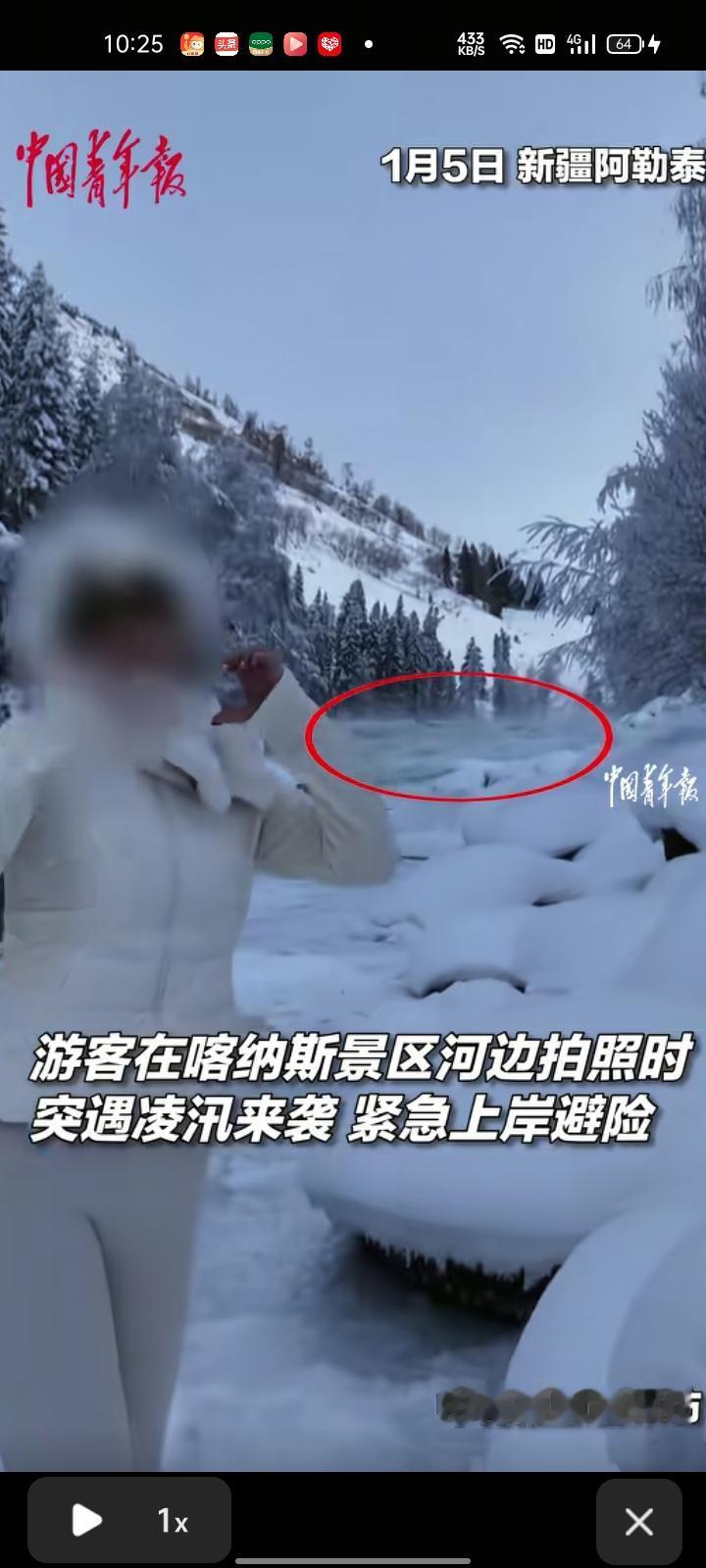 1月5日,新疆阿勒泰。游客在喀纳斯景区河边拍照时,突遇凌汛来袭,紧急上岸避险,等他们撤离现场时,河道瞬间就满了。在此提醒大家,户外拍照一定要把安全放在第一位。