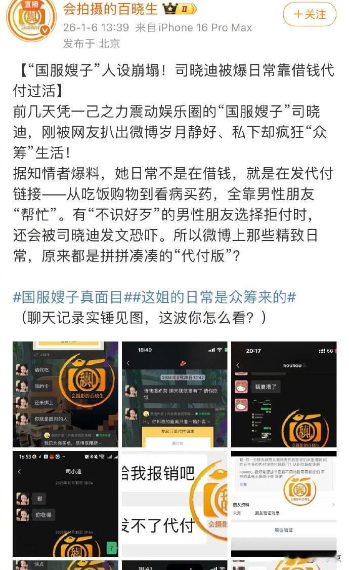 连卫生巾都蹭?司晓迪被爆细节式捞女,男星排队辟谣! 狗仔直播爆料真猛,直指司晓迪是捞女,细节竟是让人帮她付饭钱、奶茶钱,连卫生巾都要别人买。 这年头,经济压力已经细致到这种程度了吗? 此前她曾发博爆料多位男艺人,结果鹿晗、檀健次、黄明昊等一众男星火速排队发声明否认,场面堪比紧急避险现场。 一边是她爆料的真实性成谜,另一边是连卫生巾都让人买的消费习惯被推上风口浪尖。