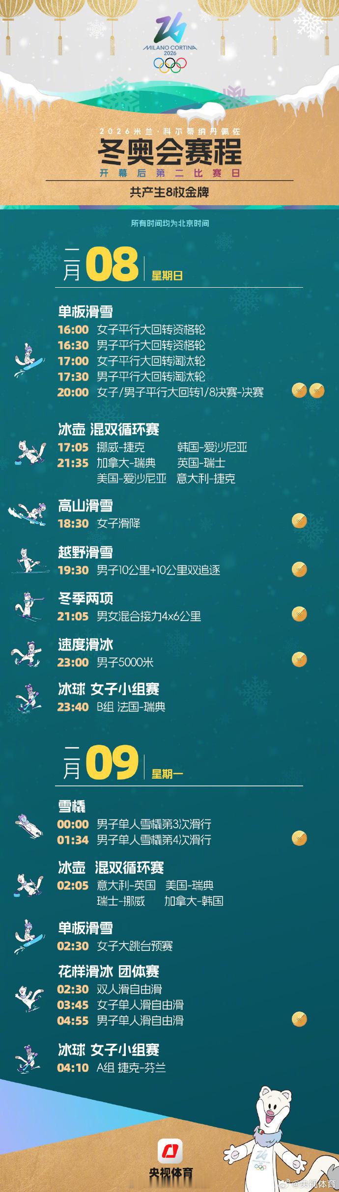 米兰冬奥会追赛指南米兰冬奥会赛程 观众朋友们安排好时间观赛 米兰冬奥会2月6日至22日举行,谷爱凌等中国健儿的冲金赛程值得关注!谷爱凌将出战自由式滑雪项目,2月16日迎女子大跳台决赛,2月21日参与女子U型场地技巧及空中技巧混合团体决赛。苏翊鸣2月7日冲击单板滑雪男子大跳台金牌,18日再战坡面障碍技巧。短道速滑混合团体接力2月10日开赛,隋文静/韩聪领衔花滑赛场,一起为中国冰雪健儿加油!米兰冬奥会30天倒计时