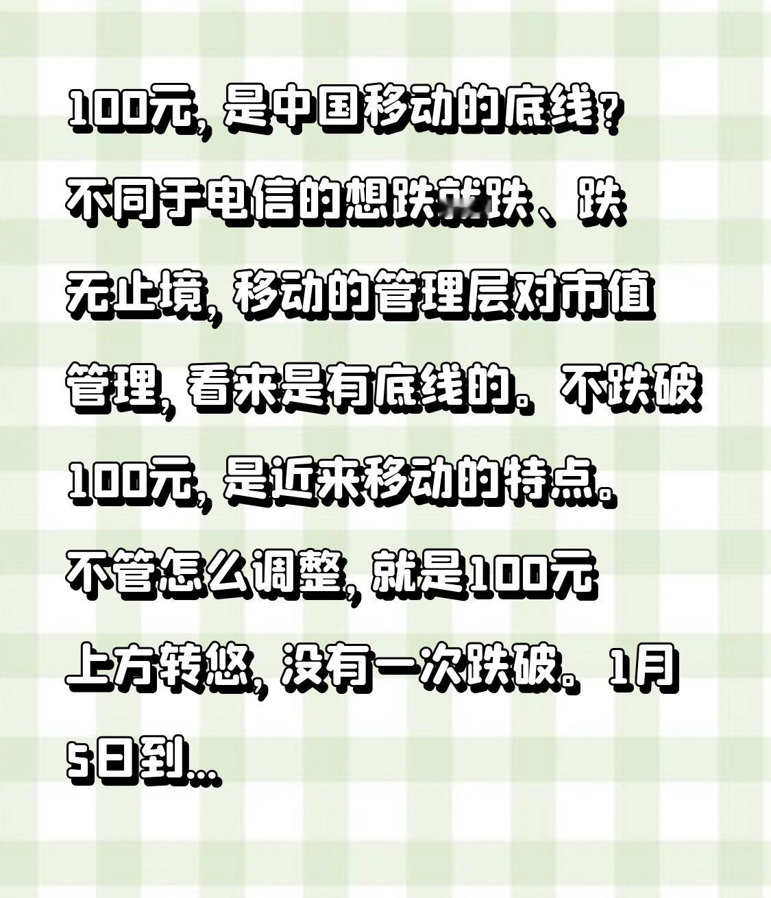 100元,是中国移动的底线? 不同于电信的想跌就跌、跌无止境,移动的管理层对市值管理,看来是有底线的。 不跌破100元,是近来移动的特点。不管怎么调整,就是100元上方转悠,没有一次跌破。1月5日到了100元整,又拉了上去。 我一直准备在100元下方,逐步买入,结果还没等到机会。