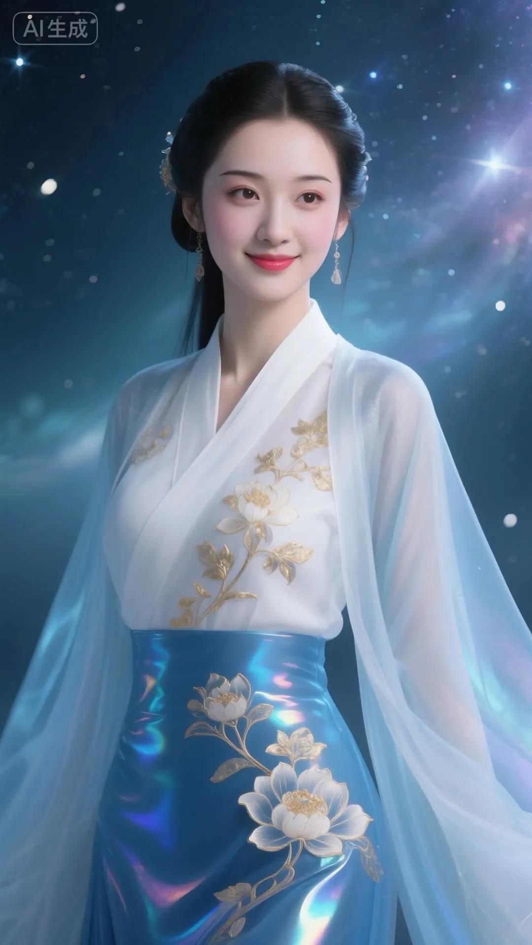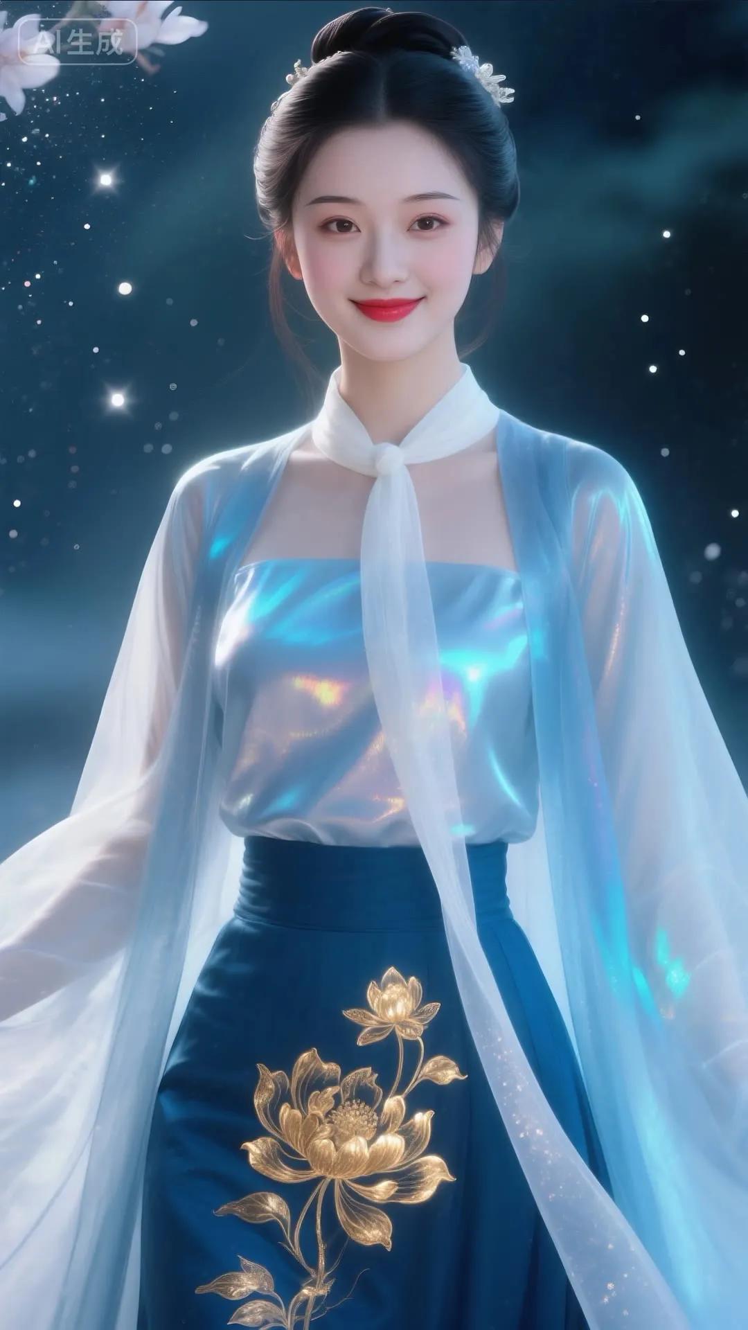 海边漫步,闪耀蓝裙,海风吹拂,优雅动人