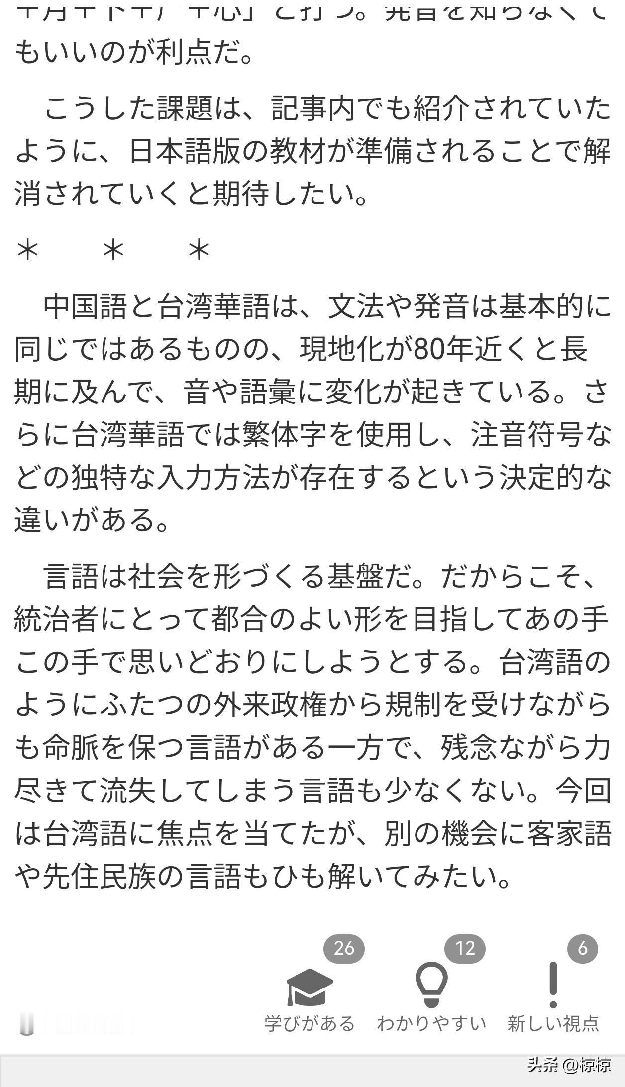 除了原本就带有某种目的的一小撮幕后人等,有时候会觉得“精日”“精美”这个群体是普遍智商偏低的,很容易被表面宣传所迷惑,大概也有主动洗脑的。 但是,看多了美西方媒体无孔不入的长期洗脑,你会发现,生活在被那种媒体包围的环境中,那种耳濡目染确实是可怕的,它和你的血液、空气一样天然存在,不给你分析判断真伪的缝隙,生活在其中,只会让你天然接受。 比如,日本一直一直在狡猾的用不易察觉的引导者身份、潜移默化地从根本上改变台湾人的认知,企图让台湾人让全世界认为台湾是脱离中国的独立存在,让全世界接受台湾的语言应该叫“台湾话”,其用心险恶令人作呕。 原文篇幅比较长,有感兴趣的朋友,我附上了全文。 △