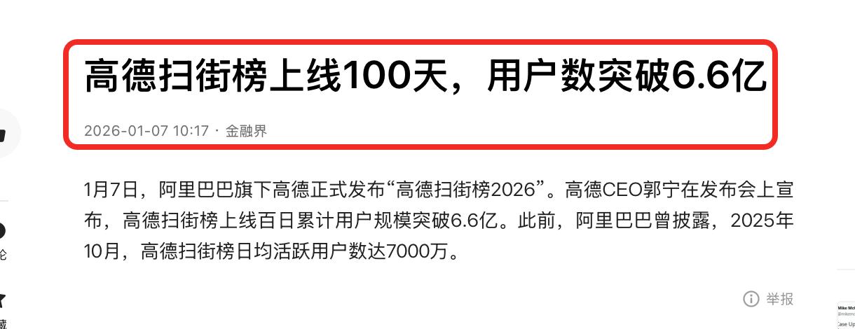 2026年刚刚开始,国内就传来一条重磅消息,和每一个人相关,信号不简单! 高德扫街榜去年9月份上线,到今天正好是百日宴。在这个具有重要里程碑的日子里,高德扫街榜公布了百日成绩单,同时,还正式发布“高德扫街榜2026”。 这个成绩单亮点很多,但最突出的有两点。 第一:高德扫街榜累计用户规模已突破6.6亿,由此,高德扫街榜也成为全球用户规模最大、增速最快的生活服务榜单。 第二:已有超86万商家主动入驻,并且这些商家生意增长是实实在在的。数据显示,入驻商家的订单量环比增长超330%,营业额环比增长超270%。 增长的数据背后,是一个个商家们在高德扫街榜的帮助下,有了更多生意的确定性。 比如重庆95后创业者谭春的新店“范梅子地摊江湖菜”,在登上高德扫街榜的“烟火小店榜”。这家店就实现了15%的稳定客流增长。 仔细想想,高德扫街榜在百日内实现用户增长快,商家入驻多,也能证明一件事,那就是高德扫街榜的出现,能够切实满足广大消费者和商家的需求,让普通人的生活更美好。 它能做到这些,离不开坚持真实的初心以及在科技方面的大力投入。 正式发布的“高德扫街榜”2026,非常能说明问题。 比如为了更好的服务用户,高德扫街榜基于世界模型规模化落地了“飞行街景”功能。这个“黑科技”能让咱们足不出户,就可以实现探店。 可以这么说。以前的千里眼顺风耳在神话中,现在的千里眼顺风耳在高德中。有了这个功能之后,往后和朋友出去吃饭,只需要用飞行街景看一看拟选择的餐厅,就能很快做出决策,提高了效率的同时还能避免踩坑。 通过高德扫街榜的百日成绩单和“高德扫街榜2026”的黑科技,我们不难发现,过去很长一段时间高德是在用科技的办法解决生活中的难题,真正实现了科技让生活更美好。 也相信在高德扫街榜的持续投入下,未来还会有更多高科技产品落地,服务于普通人的生活,在高德扫街榜的带领下,估计未来会有越来越多的企业投入到科技研发中去!