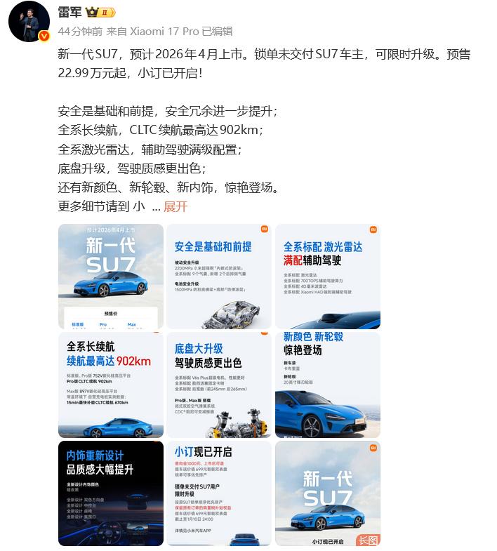 开年的20-30万纯电轿车市场,小米又来“搞事情”了。1月7日上午10点,新一代小米SU7正式开启小订,22.99万元起售,预计2026年4月上市,还捎带手给锁单未交付的老车主们,送上了一份“限时升级”的惊喜福利。 对比上一代21.59万元的起售价,新一代SU7贵了1.4万元,但这笔差价花得明明白白。 先聊大家最关心的安全,新车直接拉满安全冗余,把“安全感”焊在了车身上,日常通勤、长途自驾都更踏实。续航更是实打实的提升,全系标配长续航,CLTC工况下最高续航达到902km,上一代车主头疼的“跨省充电焦虑”,这下能缓解不少。 辅助驾驶这块,新一代SU7直接把“门槛”给拆了——全系标配激光雷达,辅助驾驶功能直接拉满,不管是入门款还是顶配款,都能享受到同款智驾体验,不用再为了选装配置多花钱。底盘也进行了针对性升级,驾驶质感更出色,过弯、变道的操控感应该会更对味儿。 除了这些硬核升级,新车还带来了不少颜值惊喜:新颜色、新轮毂、新内饰齐齐登场,审美直接跟上年轻人的节奏,开出去辨识度拉满。 最让老车主开心的,莫过于那波“限时升级”福利。锁单还没提车的老车主,不用多花一分钱,就能直接升级到新一代车型,相当于花老款的钱,享新款的配置,这波操作属实把“宠粉”写在了明面上。 在20-30万纯电轿车赛道里,不少竞品还在把激光雷达、长续航当作中高配的“卖点”,新一代SU7直接一步到位拉满配置,纠结这个价位车型的朋友,又多了一个靠谱选项。【来自懂车帝车友圈】
