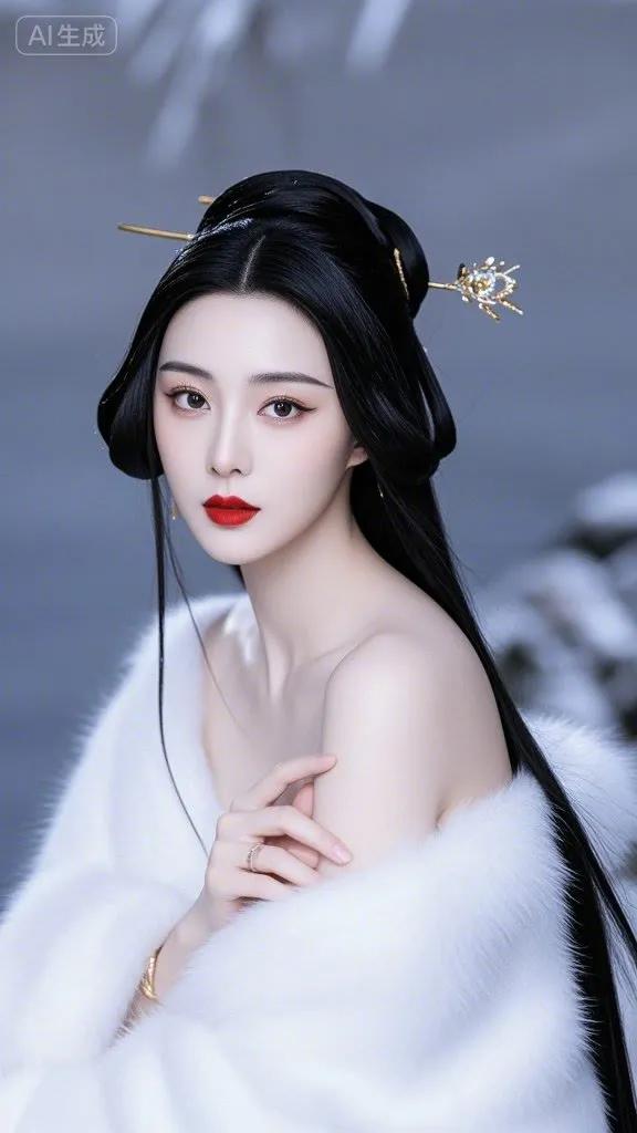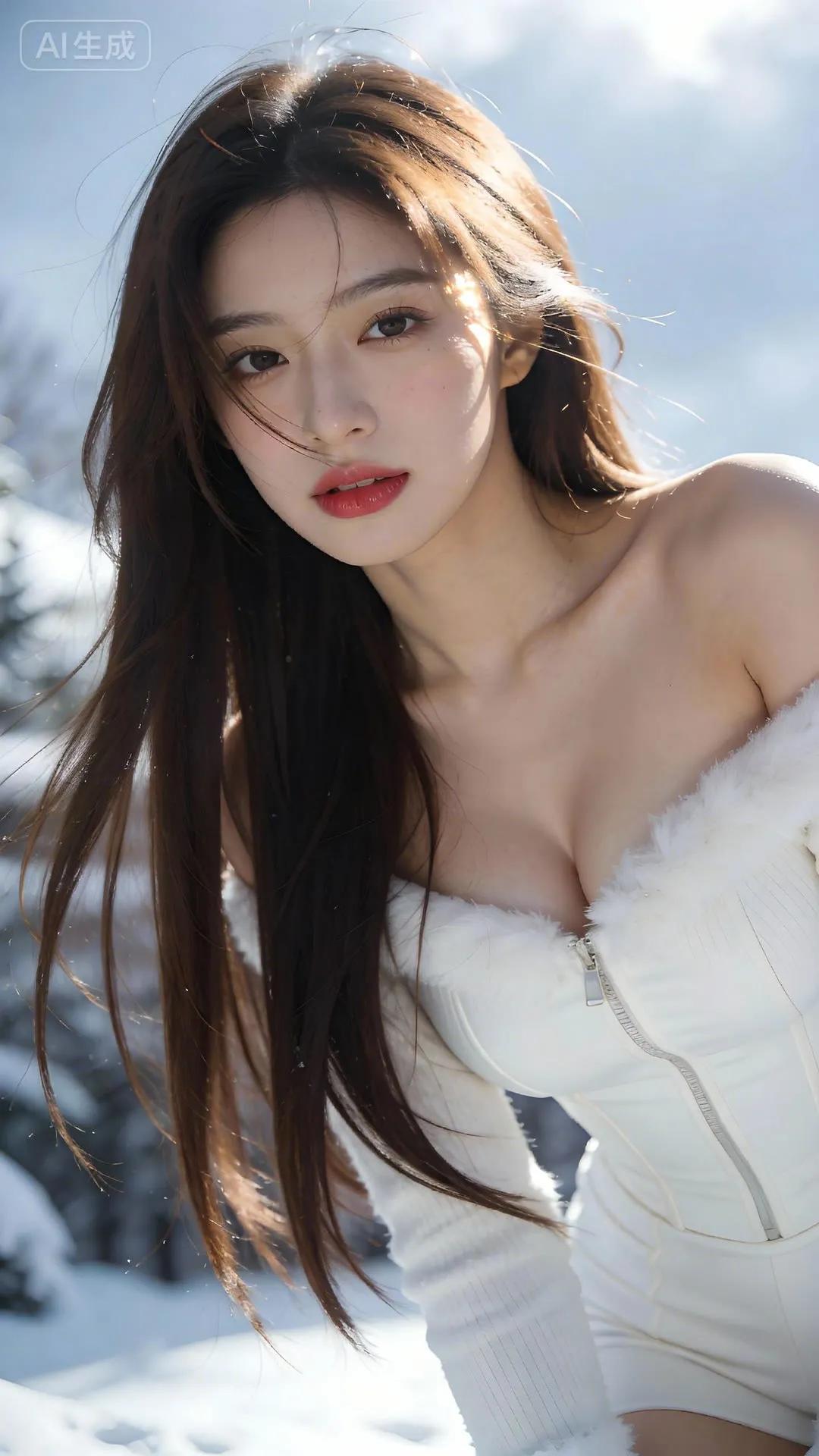 冬日暖阳下,红唇少女与雪景相映成趣。