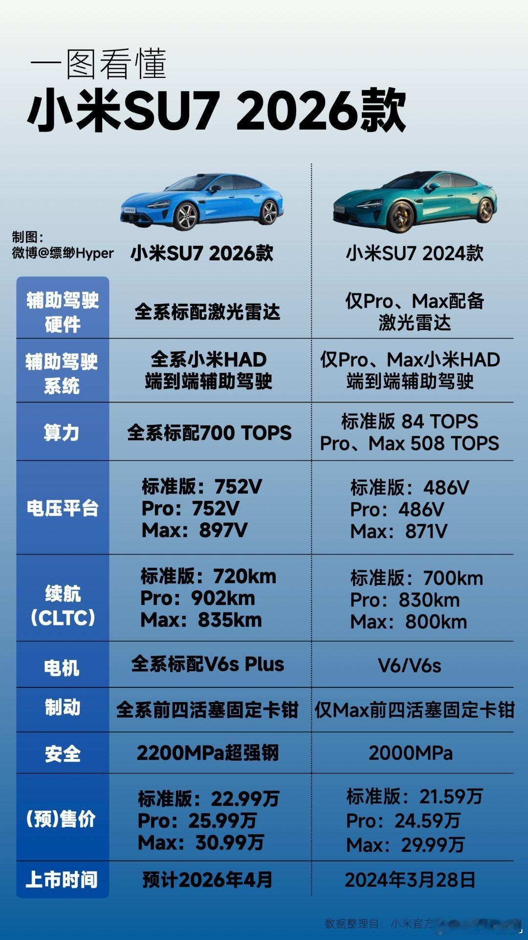 小米突然来个王炸消息,直接开启小米SU7新款的小订,发布会都没开,先开了小订,而且全新的卡布里蓝一眼看过去就很高级,我说它是50万以内最好看的轿车大家没意见吧?小米SU7的外观是公认的好看,这颜值走到路上回头率绝对爆款。其实按照电车行业的更新换代速度,1年一代很普遍,甚至有厂商一年2-3代,小米SU7能维持2年才换新版本也算是非常罕见了,这次配置提升也是相当给力,具体参数给大家一图展示了,这么大的提升才给22.99起售的预售价,这到时候订单量怕是又得排到明年了。小米新一代SU7全新配色卡布里蓝数码科技评论