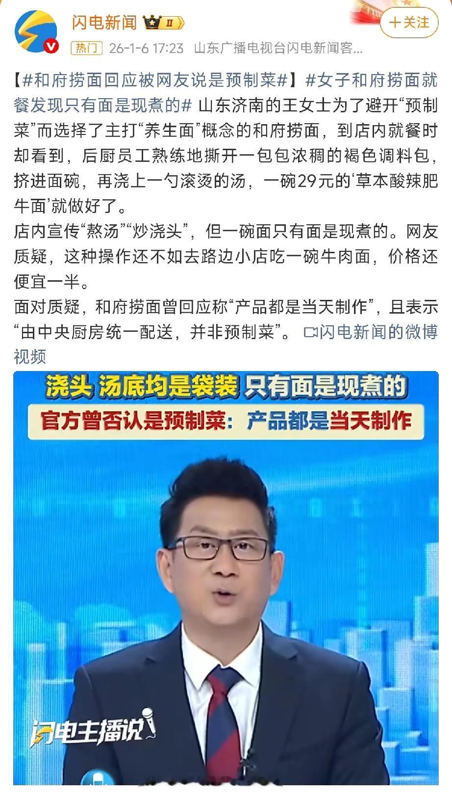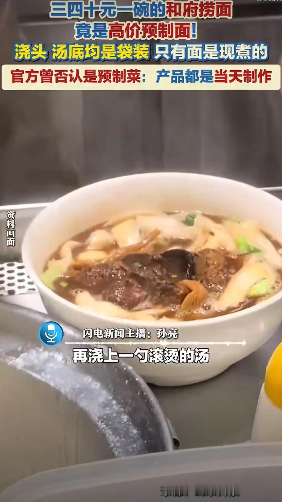 济南王女士花29块买了碗“养生面”,眼睁睁看着后厨撕开一袋袋褐色酱料包,当场就懵了。 这事儿发生在今年1月。王女士专门选了主打“书房养生”概念的和府捞面,就是想躲开预制菜。 结果呢?后厨员工熟练地撕开浓稠的料包,挤进面碗,再浇勺热汤,一碗“草本酸辣肥牛面”就算好了。整个过程,除了面条是现煮的,其他全是预包装。 有媒体记者去核实时,发现情况确实如此。操作区里煮面炉最显眼,旁边堆满贴着代码的预制食材袋。从拆封、加热到组合出餐,全程用的都是料包。 有消费者吐槽:“这和在家煮泡面有啥区别?路边小店现炒的牛肉面,价格还便宜一半。” 更刺痛人的是宣传语。门店挂着“熬汤”“炒浇头”,实际却是料包冲调。面对质疑,和府捞面回应:“产品都是当天制作,中央厨房统一配送,并非预制菜。” 这话听起来像玩文字游戏。消费者在小红书和抖音上热评:“当天制作?那我家冰箱里的速冻水饺也是当天煮的啊!”“配料表六行全是添加剂,还好意思说养生?” 价格也让人来气。同样一碗面,北京两家店能差出7块钱,差价超20%。和府解释这是“门店分级策略”,可消费者点餐时压根儿不知道这家是啥级别。有顾客因为吐槽价格差被举报,要求删视频,理由是“造谣门店”。 其实和府的日子也不好过。从2020到2022年,三年亏了7个多亿。2024年同店销售额又下滑15%,撑不起“高端”定位了。去年底开始降价,开放加盟,想走“性价比”路线。 说到底,这事儿卡在信心里。消费者不是不接受工业化,是不接受被当傻子。你卖29块一碗,就得让人吃得明白。中央厨房可以统一配送,但别用“当天制作”模糊概念。 与其在文字上打转,不如把配料表说清楚,把价格定透明。餐饮的底子是信任,不是故事。