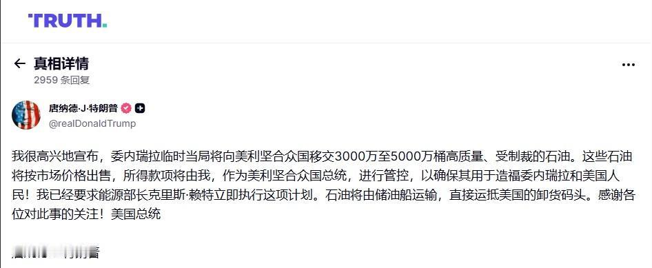 特朗普宣布明抢:格陵兰岛和委内瑞拉的石油,我全都要 特朗普开始明抢了。 6日特朗普在社交媒体上“很高兴”地宣布,委内瑞拉将向美国移交3000万至5000万桶石油,这些石油将按市场价格出售——但所得款项不会落入委内瑞拉政府的口袋,而是交给他特朗普分配,以“确保用于造福委内瑞拉和美国人民”。特朗普称美国已“掌控”委内瑞拉 同一时间,白宫方面也公开承认,特朗普及其团队“正在讨论夺取格陵兰岛的各种方案,动用武力也是可用的选项之一”。 显然,美军成功绑架马杜罗,让特朗普的野心急剧膨胀,他发现,在这个西半球的后院,无论是军事上还是经济上,没有哪个国家能真正对抗美国,特朗普可以像拿捏软柿子一样欺压他们,既攫取实质利益,又向国内民粹输送情绪价值。委总检察长要求美立刻释放马杜罗夫妇 面对特朗普对格陵兰岛的觊觎,丹麦首相弗雷德里克森那句“武力入侵将导致北约解体”警告,听起来似乎后果很严重,但实际上毫无约束力。 特朗普已经屡次直接过间接地表达过对北约的厌恶,北约存在的意义始终在于,欧洲需要美国庇护,而非美国需要欧洲的支持。 因此,以弗雷德里克森为代表的欧洲政客,似乎仍沉浸在后冷战时代的幻觉中,以为自己还有被美国拉拢的价值,完全没有意识到,在特朗普的“美国优先”逻辑下,欧洲早已从战略资产沦为可有可无的附属。格陵兰岛的危机,或许正是北约走向终结的导火索,而特朗普很可能乐见其成。
