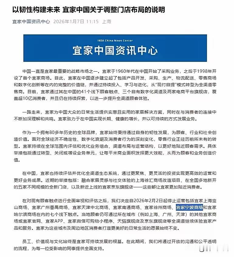 记录我的2026 宜家 重要更正:今早所传徐州宜家家居超市相关情况,并未得到官方证实,实乃网络误传。没想到,网络传言己被证实,俺搞错了,应道歉。随后便看到宜家中国发布资讯,称包括徐州、南通、哈尔滨、宁波等地的7家宜家超市,将于2026年2月2日停业。徐州宜家2018年开业,2026年关门,仅经营8年,着实令人唏嘘。 城市 南通 哈尔滨