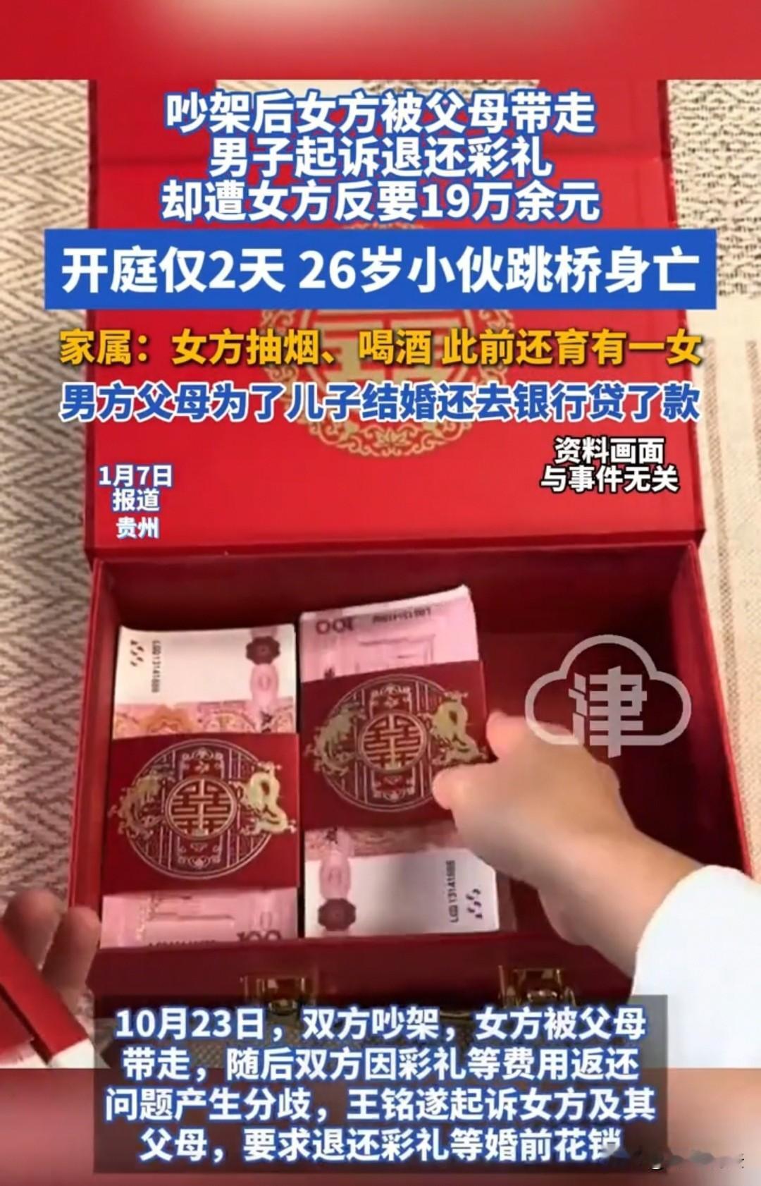 贵州,女子又抽烟又喝酒,还带着一个小孩。男子却就是爱上了她,即使借钱贷款,也要把她娶进家门。可是结婚才23天,两人就因为吵架分手,女方父母还赶来把女儿带回了家中,此后便一直不回来。男子赌气要求返还彩礼,可对方直言,还得让男子支付19万元,声称自己的嫁妆、酒席花了不少钱。最后双方开庭对簿公堂,两天后,男子想到种种的过往和当下的窘境,一跃而下,跳入江河,不省人事。 2025年的国庆,贵州的乡村被红绸与鞭炮声裹得暖意融融。26岁的王铭站在自家崭新的院门前,望着迎亲队伍里穿着红裙的24岁新娘,嘴角的笑意怎么也藏不住。 为了这场婚礼,这个本就拮据的家庭倾尽了所有:父母挨家挨户向亲友低头借钱,还咬牙从银行贷了5万元,才凑齐了女方要求的大额彩礼。 在王铭眼里,新娘的抽烟喝酒不算什么,那段过往里的孩子也早已是过眼云烟,他满心期盼着,这场婚姻能让他从此告别孤单,撑起一个属于自己的家。 婚礼的酒席办得热热闹闹,宾朋满座的喧嚣里,王铭敬完一轮又一轮酒,脸颊发烫,心里却比蜜还甜。 他以为,红烛高照的夜晚,是幸福生活的开端,却没料到,这场看似美满的结合,不过是一场短暂的烟火。 婚后的日子并没有如想象中那般顺遂,两人性格里的隔阂渐渐显露,琐碎的争吵成了家常便饭。 10月23日,距离婚礼不过二十余天,一场突如其来的争执彻底点燃了矛盾。 新娘的娘家人闻讯赶来,怒气冲冲地将女儿带回了娘家,徒留王铭站在空荡荡的新房里,红烛的余光摇曳,映得他的身影格外落寞。 日子一天天过去,女方没有丝毫回头的迹象,王铭的心彻底凉了。 他明白,这段婚姻已经走到了尽头,当务之急是拿回那笔压垮全家的彩礼——那可是父母的血汗钱,是沉甸甸的债务。 可当他提出退还彩礼的要求时,得到的却是一个让他始料未及的答复:女方不仅拒绝返还彩礼,还拿出了一份长长的清单,细数办婚礼、买嫁妆的各项开销,反过来要求王铭赔偿19万元。 而王铭心里清楚,女方所说的酒席、嫁妆等费用,加起来不过13万元。 协商无果,双方只能对簿公堂。12月28日,法庭的大门在王铭面前缓缓打开,冰冷的座椅、严肃的法槌,还有对面女方家人冷漠的眼神,都让他喘不过气。 庭审上的每一句话,都像一把尖刀,刺穿着他本就脆弱的神经。 他看着自己亲手写下的借条,想着父母佝偻的背影,想着银行催款的短信,再想到这段短暂婚姻里的甜蜜与伤害,只觉得眼前一片黑暗。 开庭后的两天,王铭独自走到了河边。冬日的河水冰冷刺骨,一如他此刻的心境。 彩礼的重压、感情的重创、未来的迷茫,像无数根绳索,将他紧紧缠绕。 他站在桥边,望着脚下奔腾的河水,脑海里闪过父母的期盼,闪过婚礼上的红烛,闪过争执时的歇斯底里。 最终,这个26岁的年轻人,再也扛不住这汹涌澎湃的绝望,纵身一跃,让冰冷的河水,终结了自己短暂而沉重的一生。 一、男子自己跳入江河去世,他作为成年人,是自己的选择,没有人故意将其推下去,因此,女方无需承担责任 根据《民法典》规定,完全民事行为能力人对自身行为及后果独立担责;侵权责任需满足“行为、过错、因果关系、损害后果”四大要件。 男子系自主自杀,女方无侵权行为及过错,与死亡无法律因果关系,故无需担责,仅可能存在自愿补偿情形。 二、女子和男子仅共同生活23天,男方因支付高额彩礼导致家庭困难、债务高筑,有权请求女方返还部分彩礼 《最高法关于审理涉彩礼纠纷案件适用法律若干问题的规定》明确,共同生活时间短且婚前给付致生活困难的,给付方有权请求返还彩礼。 双方共同生活时间极短,男方举债付彩礼致生活困难,符合返还条件,女方开销可合理扣减,法院会酌情支持部分返还。 对于此事,大家如何看?素材来源于这是哈尔滨2026.1.7