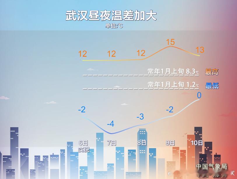 【气温波动】未来的气温,一个是冷空气导致东北一带起伏波动大。另外中东部多地昼夜温差加大,一天中冷暖差异也很大。比如未来3天,长沙、武汉、合肥最高气温稳中有升,明显高于常年1月上旬。但最低气温持续偏低,合肥、武汉都是在0℃以下,长沙在0-2℃之间。昼夜温差会拉大到15℃以上,昼暖夜冷的特征很突出。