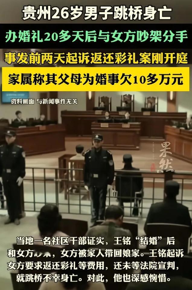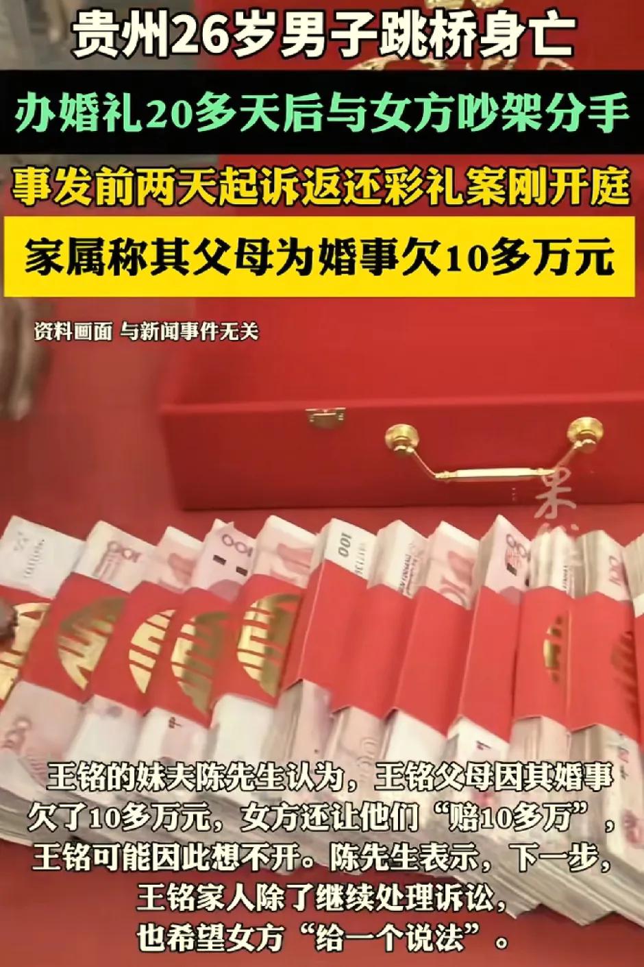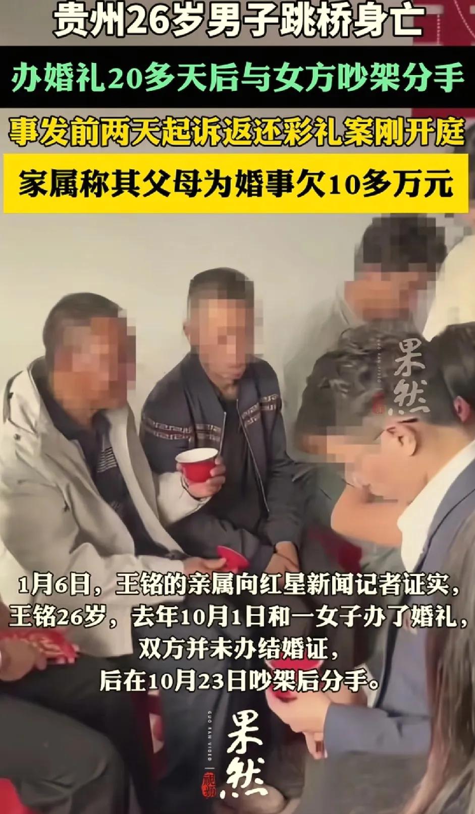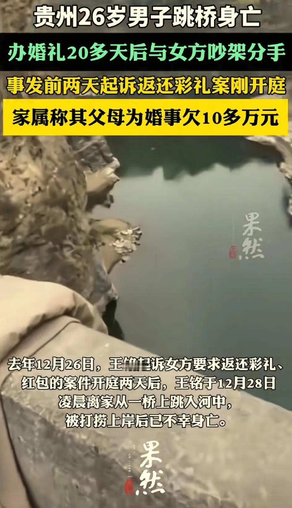 贵州26岁男子娶二婚女,22天分手,想讨回十几万彩礼反被女方讨要19万,跳桥身亡,家属发声。 26岁的王某,父母托媒人给他介绍了二婚女,女方24岁带着一个女儿。 两个人去年7月份认识,8月份订婚,10月1日结婚,没有结婚证,只办了酒席。 彩礼88000,加上买的金银首饰,酒席花的钱,还有红包在一起十几万。男方家里很穷,贷款贷了5万,和亲戚借了5万。 去年十一。 结婚之后,王某发现女方喜欢喝酒抽烟,两个人就吵起来。10月23号女方从男方家里走了,从此以后就分手了。 王某家就想讨回彩礼。因为现在人财两空,人走了,欠的账还没还。 女方反咬一口说自己家办酒席花了13万,亲戚家还包了两个13800的红包等等。还反向王某讨要19万。 王某想不开,于2025年12月27日凌晨1点多离家出走,早晨6:50从当地的一座桥上跳下。桥离河面十八九米,水深10多米。 12月还是8日下午被打捞上来。至今2026年1月9日还未下葬。 网友觉得这个男的才26岁,小伙子长得很精神,白白净净的,何必去娶一个二婚女呢?而且这个女的有不良嗜好。 结婚22天就分手,彩礼不退还反咬一口。真是遇人不淑啊! 现在可怜的是王某的父母了,一贫如洗的两个老人,还欠着10万的外债。本来想着让儿子早点结婚传宗接代,结果现在儿子也没了。 真的是一把辛酸泪啊! 这样的事件其实应该给人以警醒。结婚不是要完成一件任务。结婚是一件很重要的人生的大事,一定要谨慎。