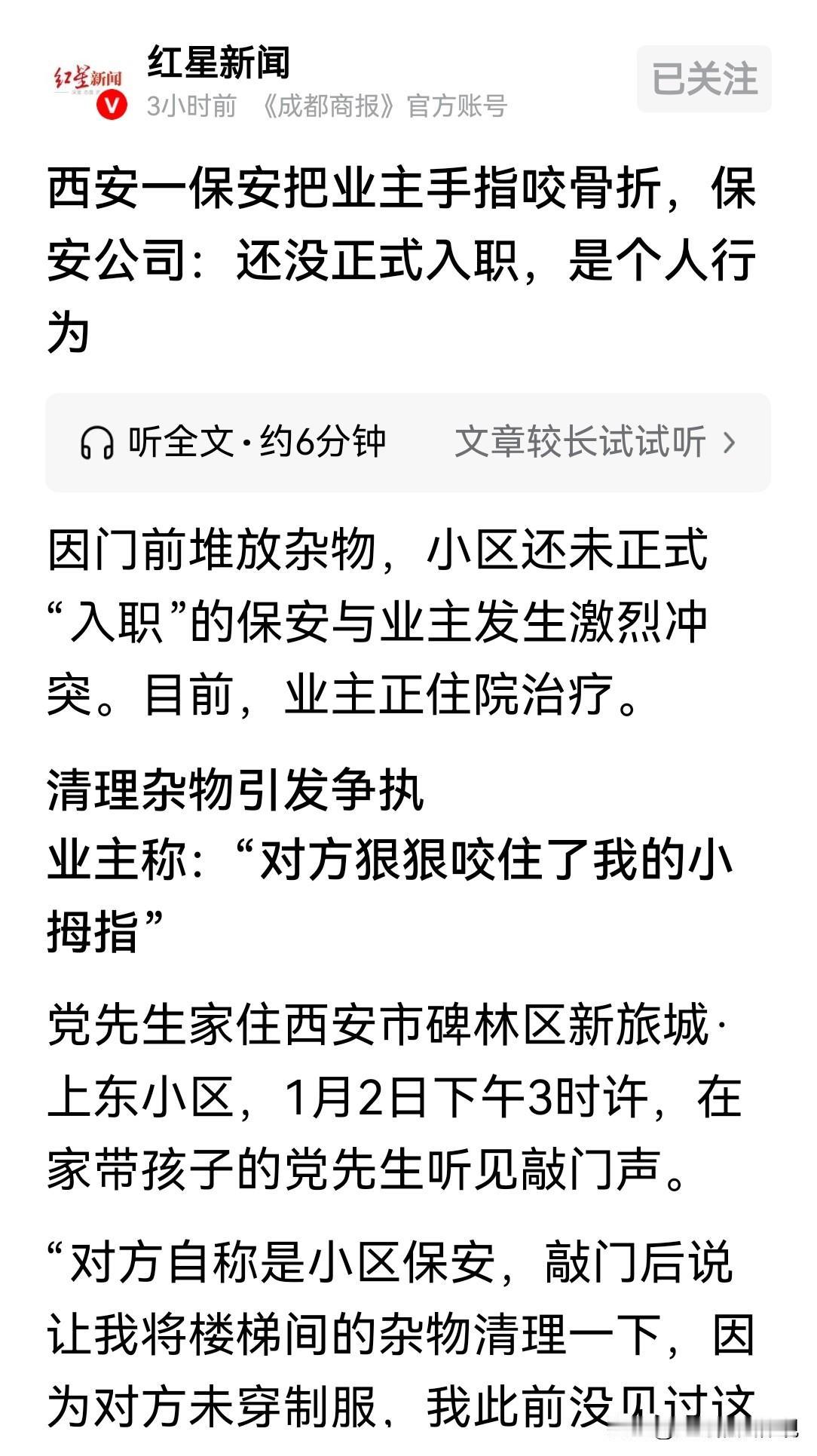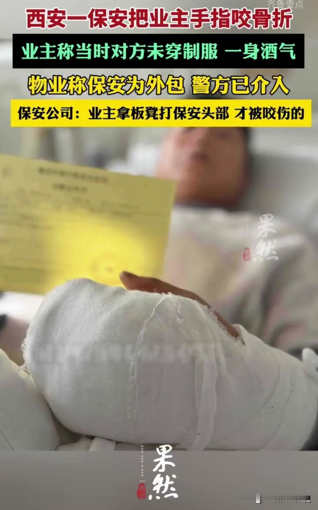 陕西西安,男子正在家中带孩子,有人敲门,称是小区保安,让他清理楼道的杂物。男子见对方未穿保安制服,先是没敢开门,后发现对方要亲自清理,就打开了门,可对方一身酒气往家里闯,吓到了小孩子,男子拿小板凳挡门,双方撕扯在一起,保安一口咬住男子小拇指不松口,满地是血,已花费医疗费1万多元。保安公司称是个人行为,物业也另有说法。 党先生平时在小区门口卖肉夹馍维生,家里有老人、孩子,全家靠他一个人养活。 1月2日下午,党先生正在家里带孩子,突然有人哐哐敲门。 他随口问了一句:干啥的! 对方自称是小区的保安,党先生把杂物堆放在楼梯间里了,让他清理一下。 但党先生发现,对方未穿保安制服,而且来人很面生,不像是小区的保安,心里就有了疑虑。 他没敢开门,只是隔着门说,自己一会儿就去清理。 但对方称,必须立马处理,不清理的话自己就动手了。 党先生觉得来人说话难听,怕他真把自家的东西清理走,就在猫眼里往外看。 没想到,那人还真动了真格的,党先生赶紧打开门。 万万没想到,自称保安的人,带着满身的酒气就要闯进他家。 家里的孩子吓吓得哇哇大哭,党先生随手拿了一只小板凳挡住了保安,不让他进屋。 随后两人先是吵了几句,后来就撕扯起来。 不料,保安一口咬住党先生的小拇指不松口,疼的他大叫。 现场满地是血,非常骇人, 党先生赶紧报了警,保安被与警方带走调查。 党先生随后赶紧去医院,经诊断为,开放性指骨骨折,影像显示左手第5近节指骨骨折。 他只能住院治疗,家里的生活平时就非常拮据,他这一住院,家里的老人孩子失去了生活来源。 可令人是愤怒的是,事发后,无论物业,还是保安公司都不管。 而是相互推诿踢皮球,没人对他的受伤负责。 所有的医疗费,都是自己承担的,目前已花费1万多元。 物业公司称,小区保安已经外包给安保公司。 此事跟物业无关,党先生要找也是找保安公司解决。 党先生本来就受了伤,他忍着疼痛,又找到安保公司。 安保公司却说,那个保安并不是正式的,他还没办入职手续。 而且事发当天并不是他当值,所以出了事,也是他的个人行为,和公司无关。 党先生对这样的说法并不认可,他认为,如果保安未入职,应属于闲散人员。 但如果没有物业或者保安公司的安排,他为什么会去敲业主家的门,还要求业主清理杂物? 而值得注意的是,这名保安在工作期间未穿工装,而且浑身酒气,明显是上班时间喝酒了。 就冲这两点,物业或者保安公司就存在失职,所以两方应承担主要责任。 而对党先生一方的描述,保安公司也不完全认可。 保安公司王经理称,案发时,那名保安是上班第2天,还没有办理正式入职手续。 而当时的情况。也并不是党先生一个人说的那样。 当天是有业主投诉了党先生家将杂物堆放在楼道,影响业主安全。 那名保安当时并不当班,他是在监控室,通过对讲机得知此事的。 在前去处理时,和业主发生了口角。 楼道没有监控,根据电梯监控,和另一名保安手机拍摄的照片,以及保安的转述,事实真相党先生先动手。 党先生拿小板凳击打保安的头部,保安被打急眼了,情急之下才咬住了党先生的手指。 事后保安头疼、头晕,但没去医院检查。 目前,保安公司也在等有关部门的调查结果,以及警方的进一步处理。 按说,保安是保护业主财产安全的。 就算是业主杂物堆放楼道,也不是什么大事,保安通知到位就可以了。 但涉事保安酒后硬闯业主家,才是双方发生冲突的原因。 对于保安公司称,属于个人行为太说不过去。 《民法典》第170条:判断职务行为的核心是是否执行工作任务、体现单位意志。 涉事保安虽未正式入职,但已实际到岗,清理楼道杂物是其职责范围。 且是通过对讲机得知业主投诉后去处理,符合职务行为认定要件,保安公司称是个人行为难以成立。 保安公司不能以保安未入职或非当值为由,推脱承担民事责任。 《民法典》第1191条第2款:用人单位的工作人员因执行工作任务造成他人损害的,由用人单位承担侵权责任。 用人单位承担侵权责任后,可以向有故意或者重大过失的工作人员追偿。 保安公司让未正式入职人员上岗,且疏于培训管理,导致保安酒后与业主发生冲突并咬伤业主,保安公司存在明显过错。 所以,保安公司应当承担侵权责任,对业主的受伤损失进行赔偿。 之后,若保安存在故意或重大过失,保安公司可向其追偿。 若党先生的伤情构成轻微伤,保安可能面临治安管理处罚,若构成轻伤及以上,可能涉嫌故意伤害罪。 若党先生确实存在持板凳击打保安头部的行为,其自身存在过错,可减轻涉事保安一方的责任。 党先生是家里的顶梁柱,他这一受伤,家里的老小都失去了依靠。 目前,警方已介入处理,党先生还在接受治疗,并等待伤情鉴定。 对此,你怎么看? 关注@赵哥的法律观,明辨是非不上当。
