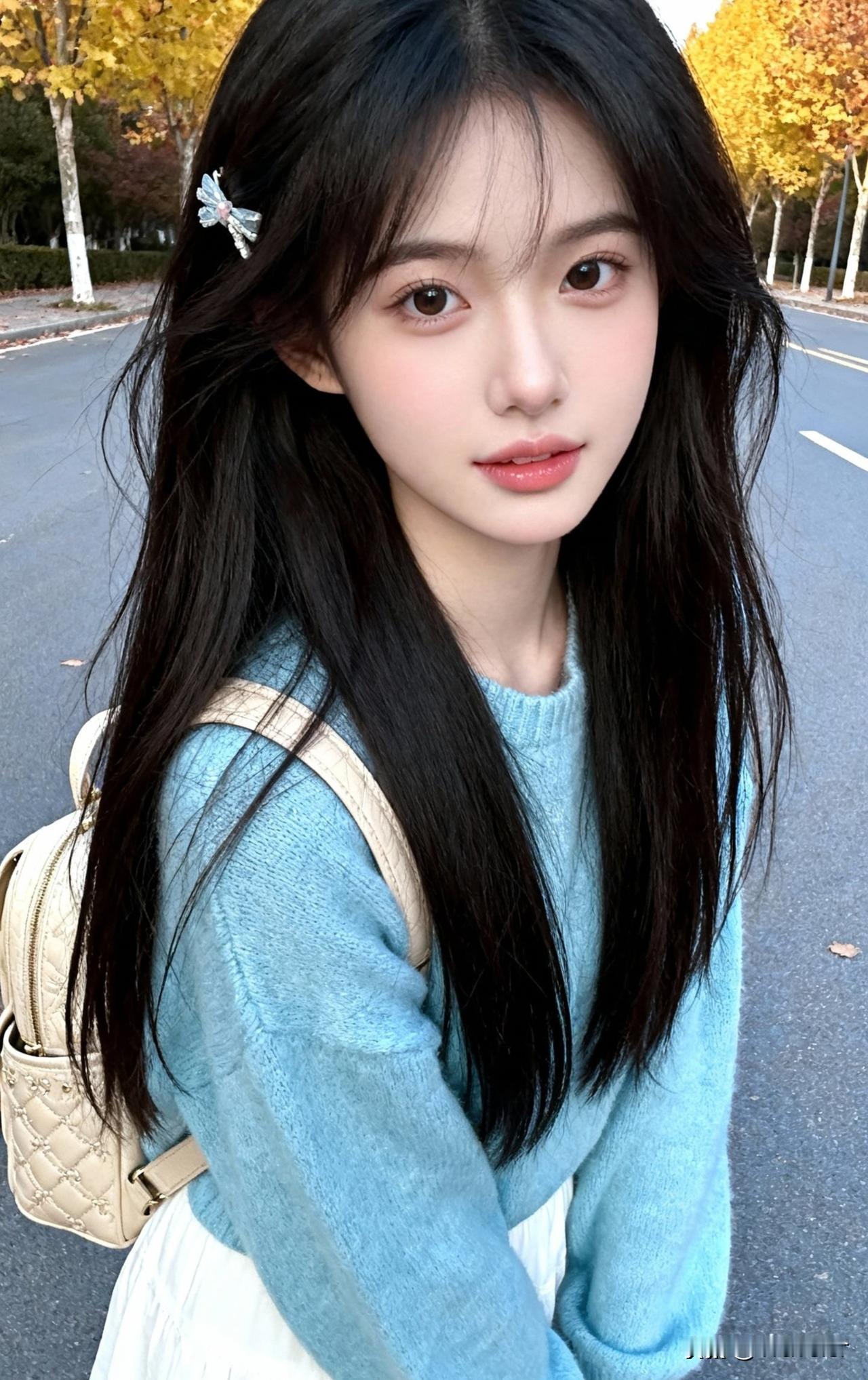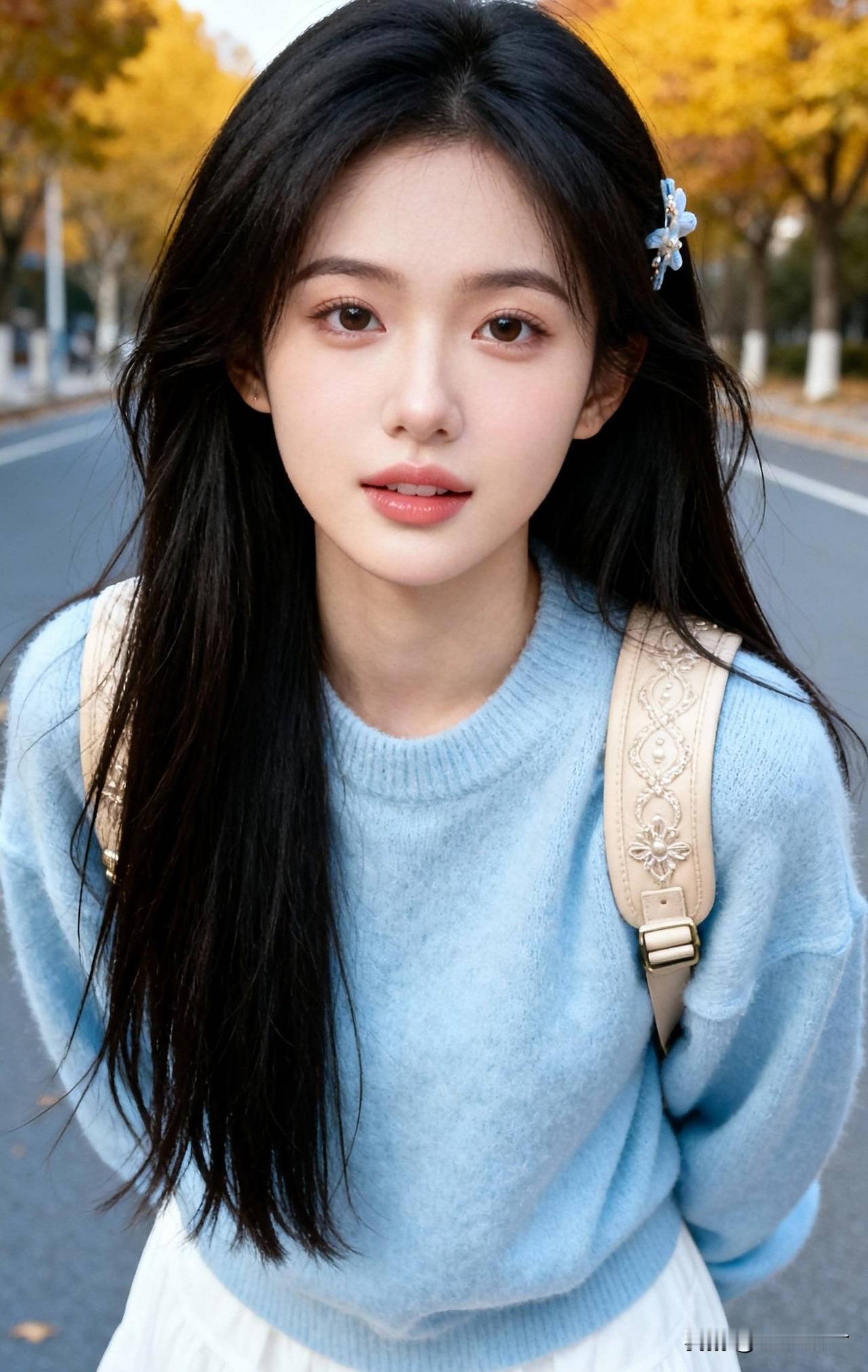 秋日校园少女,温柔蓝毛衣,背包轻装上阵🍂💙📚