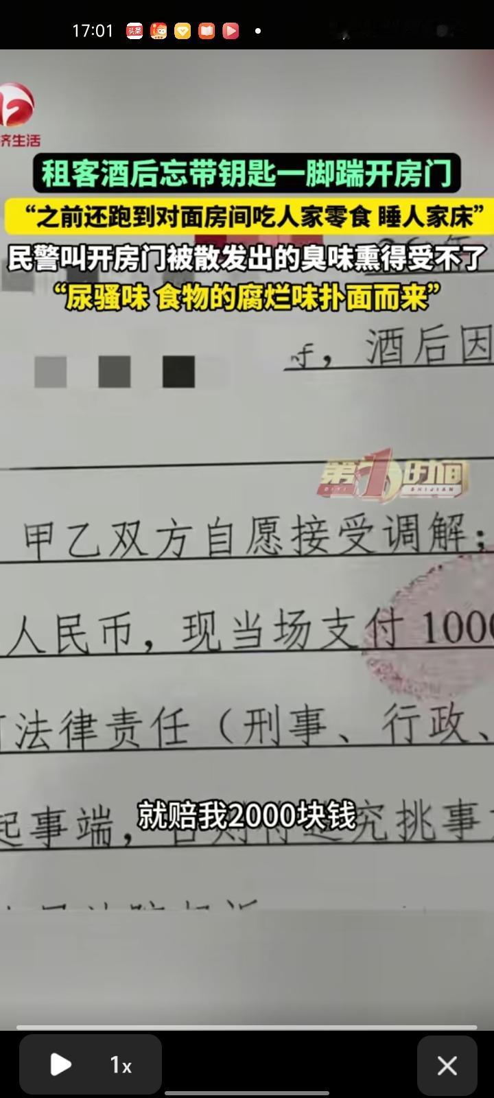 1月4日,浙江台州。租客酒后忘带钥匙,一脚踹开房门,尿骚味和食物腐烂味扑鼻而来,让人受不了。 房东李女士介绍称,这个租客租了她的房子两个月了,当天晚上他是酒后回来找不到钥匙,看到对面房门没有锁,先是进入别人房间一通折腾,把房间里的零食吃了,床也睡了,把人家床上也弄的都是血,外衣外裤都脱掉了,经过协商赔偿2000元