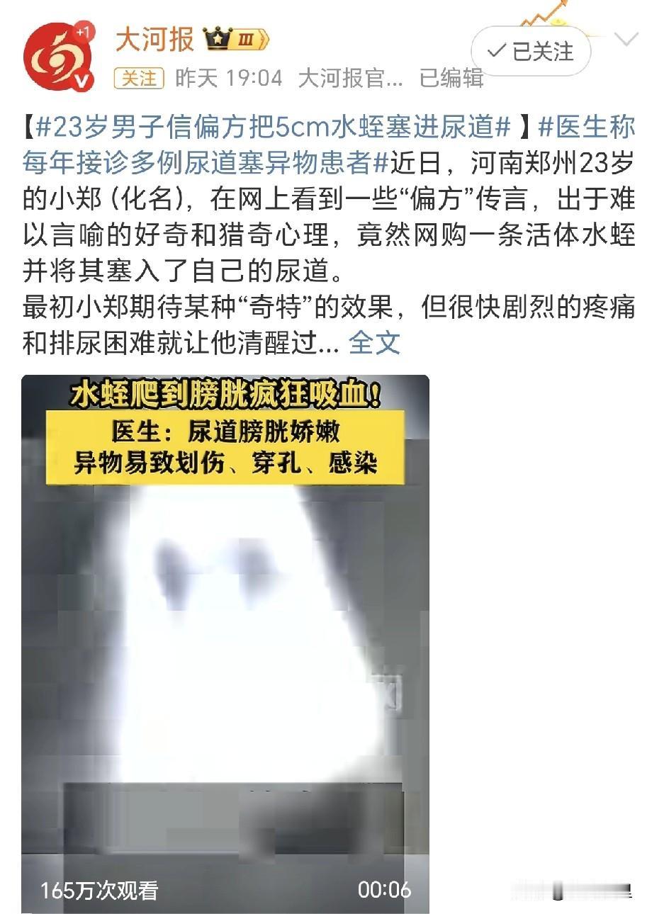 刷到大河报的一个新闻,令人震惊到难以言喻。一个23岁的小伙,轻信网上一些未经证实的所谓“偏方”,出于好奇,买了一条水蛭,放进了体内。结果,疼得他最后连忙跑去医院,医生最终只能通过手术才将水蛭取出。 这种极端的行为, 实在是让人很难理解。光是想想就让人浑身冒冷汗。医生说,这样的手术有风险不说,还可能导致尿道反复感染、一辈子排尿疼的后遗症。一次糊涂的行为,需要一辈子承受病痛的折磨,想后悔,也已经来不及了。 有难言之隐,或者好奇自己的身体,最安全、最正确的途径是咨询专业医生。这远比在互联网的海量真假难辨的信息中,盲目寻找“秘方”要可靠得多。千万不要用如此轻率而危险的方式,去满足所谓的好奇心理,否则最终承受伤害的只能是自己。