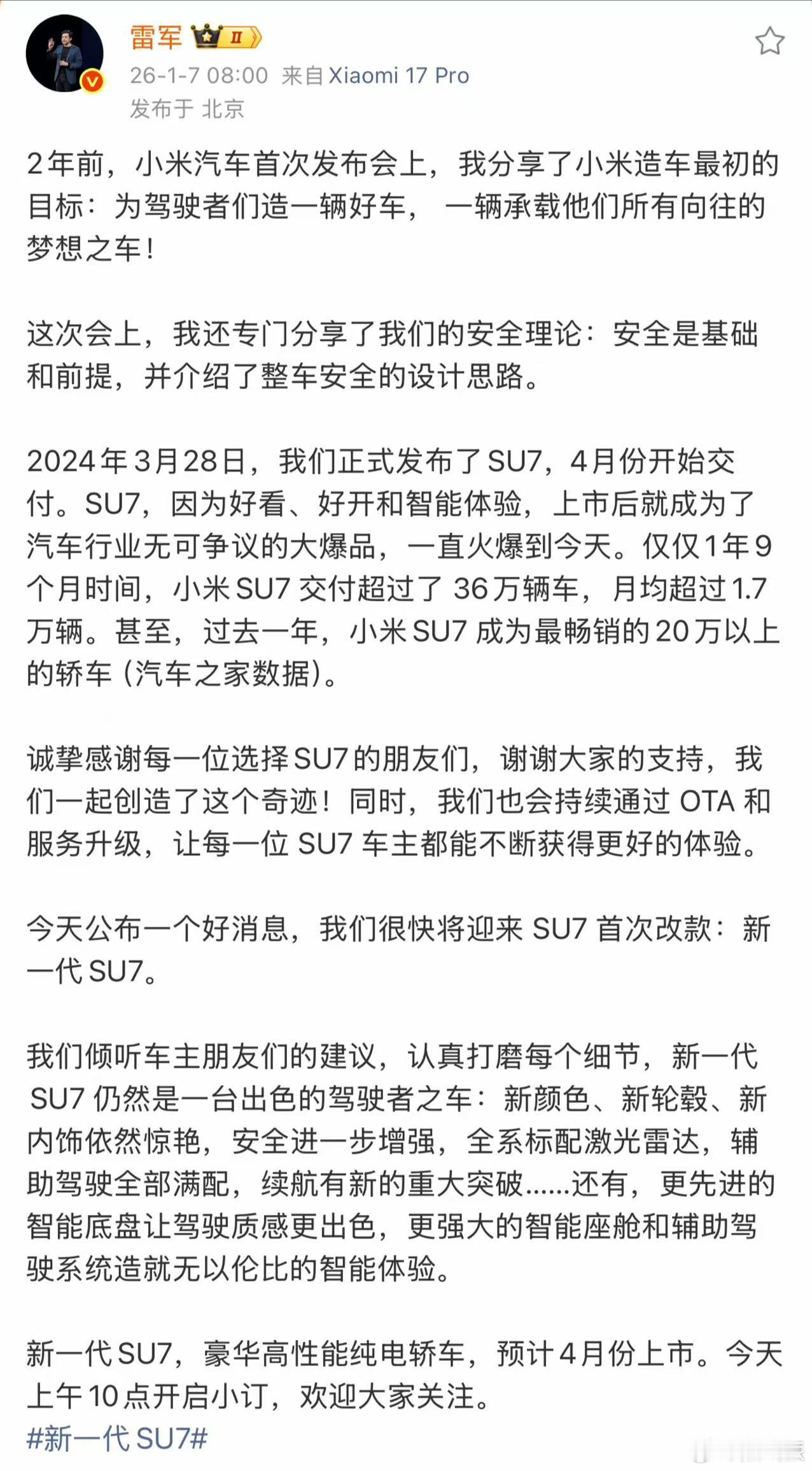 小米新一代SU7全新配色卡布里蓝 新一代小米SU7终于来了!雷总官宣了全新小米SU7四月份上市,而且这个新配色「卡布里蓝」戳中我了,小米汽车真的是懂年轻人,从海湾蓝,到璀璨洋红,到鹦鹉绿几乎每一款新配色都是爆款,这个卡布里蓝毫无疑问会是又一个爆款色了!从小米公布的海报上看,新一代小米SU7还是沿用了经典的设计,据说在细节配置上和辅助驾驶的硬件上会有进一步升级,目前官网的预售价比上代小涨了一万多块,讲道理以小米SU7的爆款体质加上全面的升级,这个涨幅我觉得也很合理。不得不说,小米还是太实在了,提前三个月公布新一代小米SU7,这才是不背刺老用户的做法!Xdm觉得新一代小米SU7这个卡布达蓝怎么样?