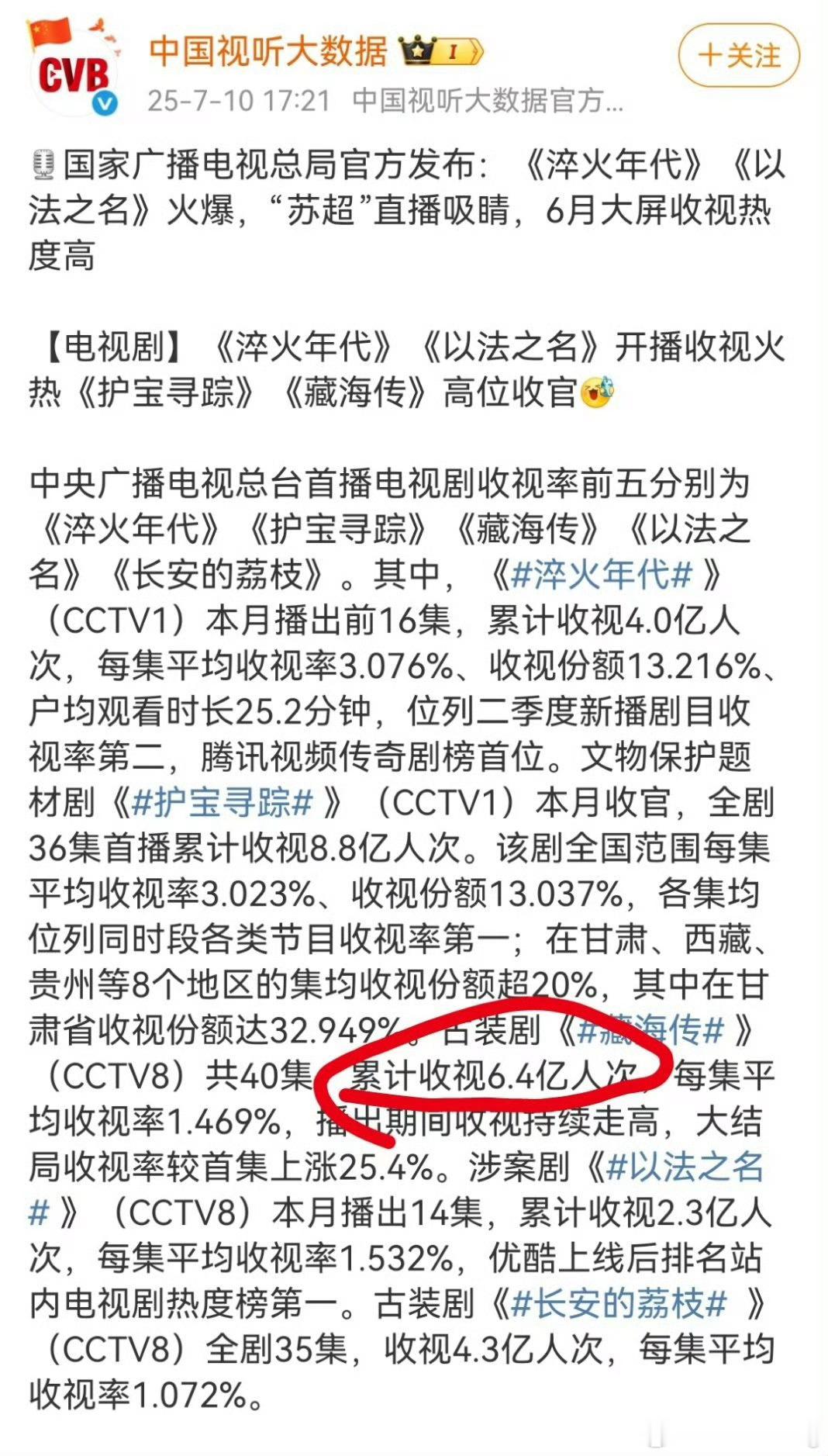 CVB收视数据发布咱也不知道为啥臧海传的数据就跟打补丁一样,各个版本都有……不过,长安二十四计在次黄档首播28集就拿下5.2亿人次的收视,就是牛啊…