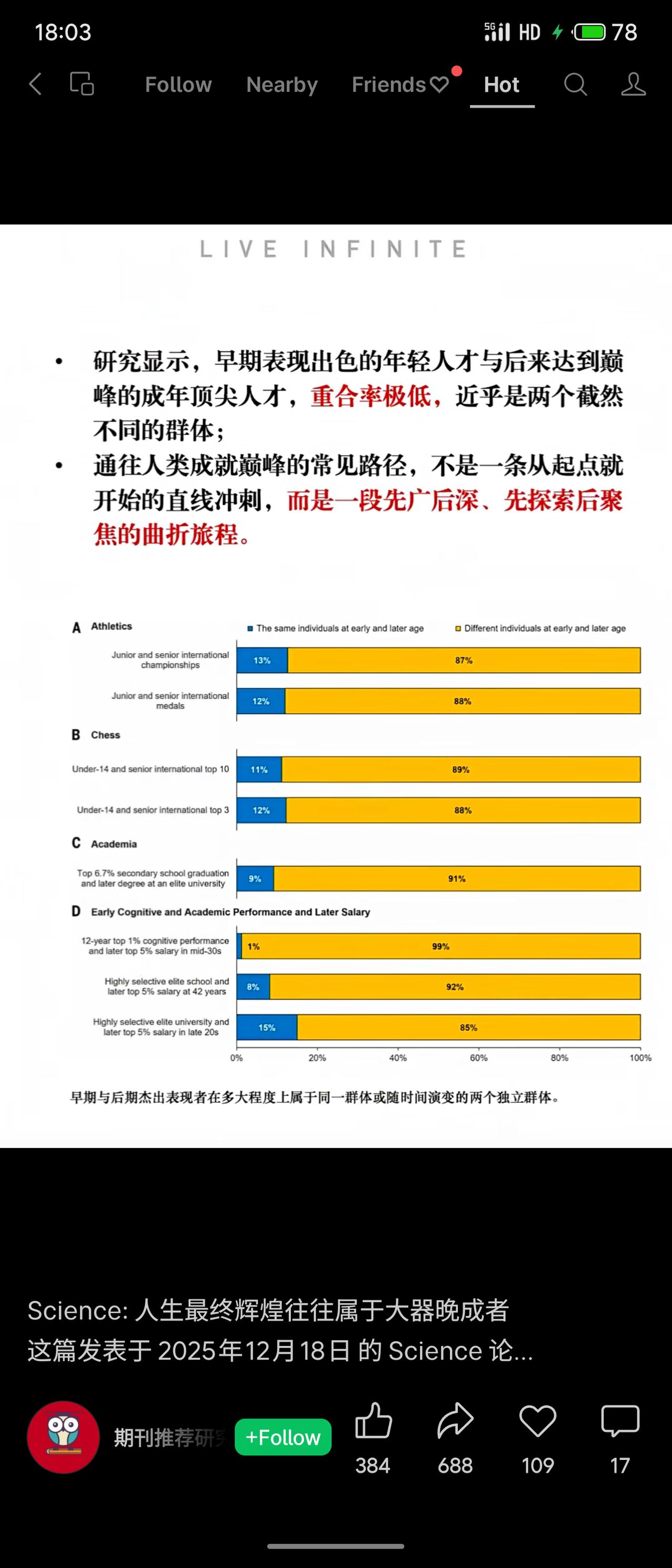 《科学》最新研究表明,人类最高成就者往往“大器晚成”。研究发现,许多世界级专家早期涉猎广泛,后期才转向深度专精,其成功路径常呈“先广后深、慢热逆袭”曲线,而非早期单一强化训练。