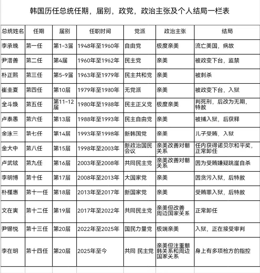 韩国历任总统任期,届别,政党,政治主张和个人结局情况 韩国自1948年建国至今已经78年,历经14任共20届总统,现任总统是第20届任期。 从第一任总统李承晚开始,到上一任总统尹锡悦,几乎很难摆脱所谓的青瓦台魔咒,13任总统,能够正常卸任,得以善终的寥寥无几,除了第八任总统金大中和第十二任文在寅,要么是官司缠身,身陷囹圄,要么惨遭政变,刺杀等恶性事件。 韩国政坛真的是血雨腥风,风云变幻,吉凶莫测。要想在韩国当上总统,没有一点狠劲,没有一点真功夫那是不可能的,除非你的机遇好,命好。 要想善始善终,明哲保身,全身而退,没有100个心眼那是不行的。 文在寅只是目前安全,最后还不一定。 尹锡悦的官司还在进行中,大概率是狱中之物。 李在明虽然历经千辛万苦走进了总统大位,但是他身上也是多个官司缠身,最后的结局如何,还要看其造化。