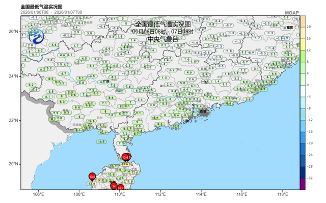 即使在广西、广东、福建东部沿海,早晨最低气温也只有个位数,连海南的最低气温也只有10℃出头。