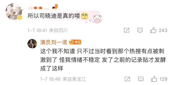 晚些时候,刘一诺发文称:“在一起过,已分手。”她表示,晒照的本意是想记录,以及“不想被当成曾经爆出来的女生那样的身份(每个女生都值得被爱被尊重)”,但没想到会发酵至此,“给大家造成了不便、伤害和困扰,对不起。”