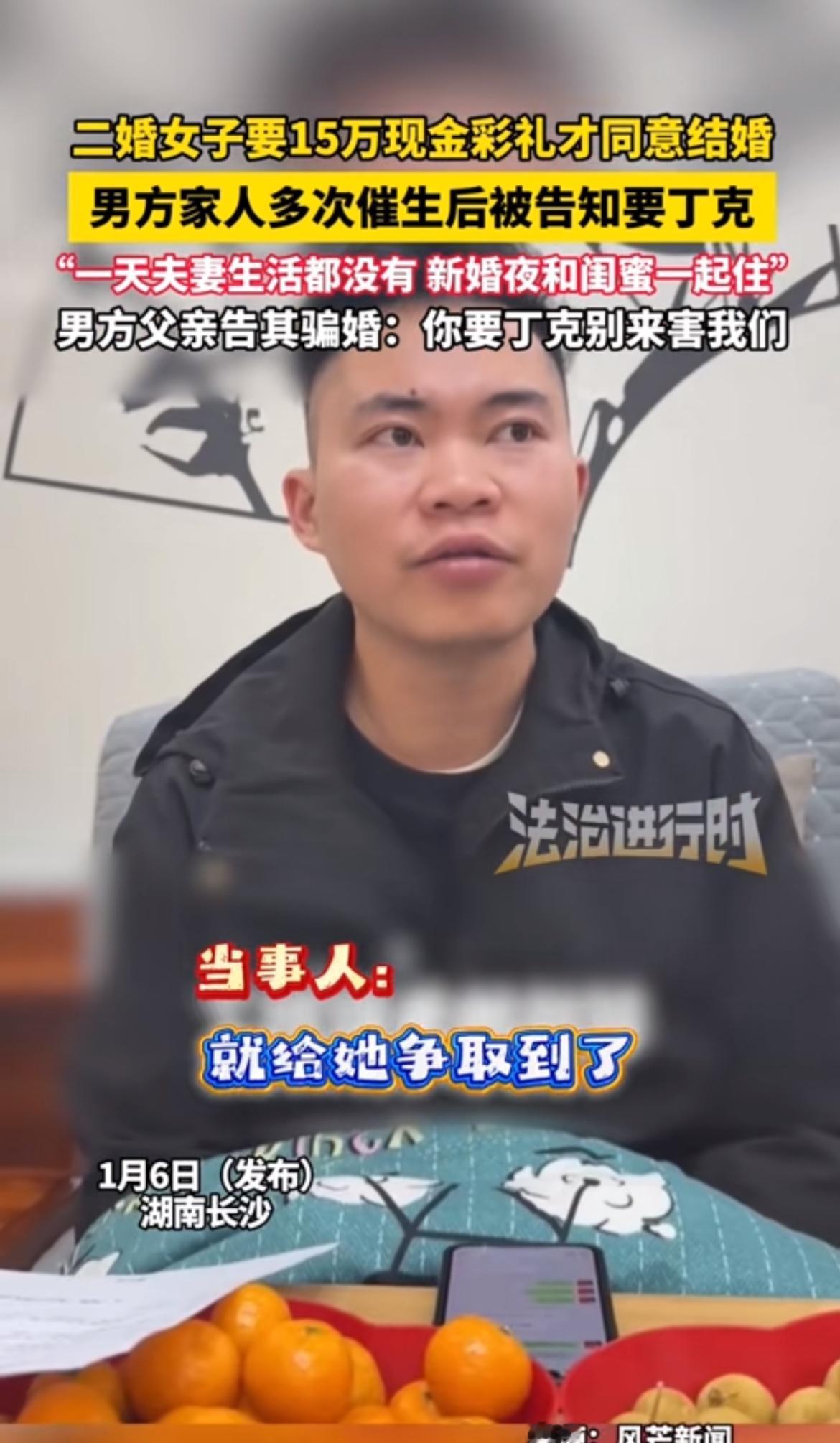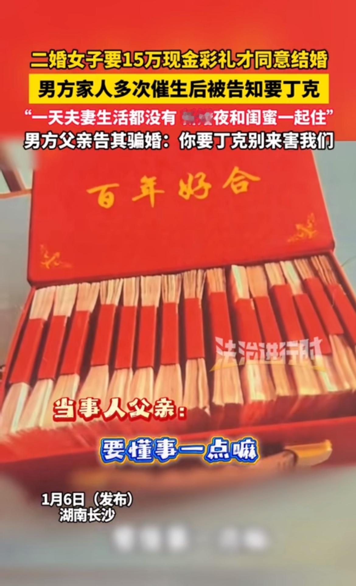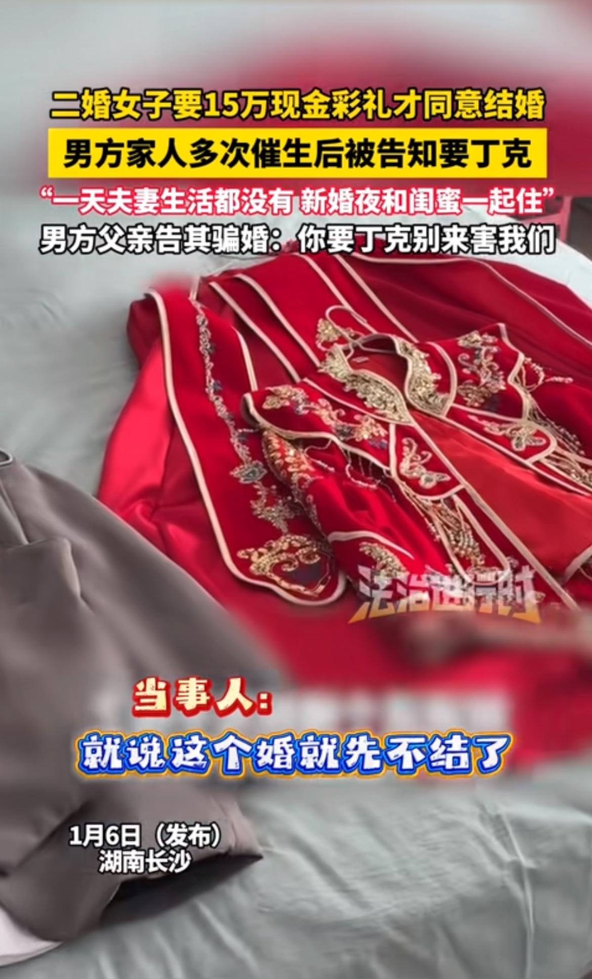 1月6日湖南这事儿真够闹心的。二婚女子要15万现金彩礼才肯结婚,男方家人多次催生,结果女子告知要丁克,新婚夜还和闺蜜住一起,男方父亲直接告她骗婚。 其实这事儿争议挺大。女方觉得丁克能享受自由、追求事业,现在很多年轻人都这么选。可男方认为婚姻得传宗接代,生育是责任义务。这就像两条岔路,两人没提前达成共识,婚后矛盾就爆发了。在婚姻里,生育这么大的事儿,婚前真得好好沟通,不然像这对,感情紧张不说,还闹上了台面。