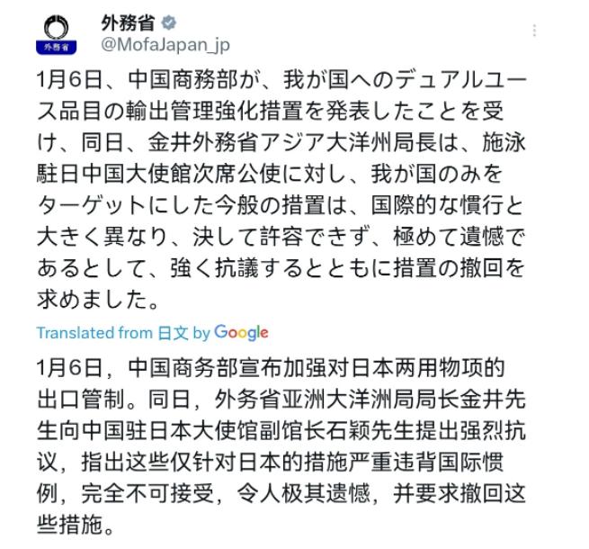 日本出来回应了,态度非常气愤!1月7日,日本外务省声称,1月6日,中国商务部宣布强化对日本两用物品的出口管制措施。同日,日本外务省亚洲大洋洲局局长金井向中国驻日大使馆公使衔参赞提出强烈抗议,称此次专门针对日本的管制措施与国际通行惯例严重不符,完全不可接受,对此深表遗憾,并要求中方撤回该措施。 乍一看日本这副义愤填膺的样子,好像真受了多大委屈似的,但只要稍微梳理一下前因后果,就会发现这场抗议根本站不住脚,甚至有点“贼喊捉贼”的味道。 所谓两用物品,简单说就是既能用于民用领域,又能改造后用于军事目的的产品、软件和技术,小到特殊化学品、无人机,大到高端计算机和相关软件都在此列。对这类物品实施出口管制,根本不是中方的独创,而是国际社会的通行做法。 不管是美国的《出口管制改革法》,还是欧盟的两用物项管制条例,都明确要求这类敏感物资的出口必须经过严格的许可审批。中国商务部早就明确表态,对具有明显军民两用属性的物项实施出口管制,是每个负责任国家的常规操作,目的是维护国家安全和全球防扩散体系。 日本自己其实也有类似的管制制度,现在却反过来指责中方“不符合国际惯例”,这显然是选择性忽视基本事实。 更关键的是,中方这次强化管制绝非凭空而为,而是对日本近期错误行径的正当回应。熟悉中日关系的朋友应该知道,自去年11月以来,日本首相高市早苗多次发表涉台错误言论,甚至公然暗示可能武力介入台海事务。 这种言论严重违反一个中国原则,粗暴干涉中国内政,性质极其恶劣。商务部发言人在解读此次管制措施时就明确指出,正是因为日本领导人的这些危险言论,中方才不得不采取必要措施维护国家安全和利益,同时履行国际防扩散义务。 换句话说,是日本先破坏了中日经贸合作的政治基础,中方的管制措施只是合理的反制,完全符合《中华人民共和国出口管制法》和《两用物项出口管制条例》的明确规定。 日本之所以反应这么激烈,核心原因其实是离不开中国的相关物资,尤其是稀土资源。可能很多人不知道,日本在新能源汽车电机、高端电子设备等关键领域急需的重稀土,比如 dysprosium、terbium 等,几乎100%依赖从中国进口。 东京的野村研究所做过测算,要是中国对日本的稀土出口限制持续三个月,日本经济将损失约6600亿日元,相当于42亿美元,这会直接导致日本年度名义和实际GDP各下降0.11%。 更值得注意的是,中方此次不仅强化了两用物品的出口管制,还有消息显示,鉴于高市早苗至今没有撤回涉台错误言论,中方还在考虑收紧对日本的部分稀土相关物品出口许可审查。这对高度依赖中国稀土供应链的日本企业来说,无疑是致命打击,这也解释了为什么日本外务省会急着跳出来抗议。 其实日本的抗议不仅站不住脚,还暴露了其当前的外交困境。事实上,在高市早苗发表涉台错误言论后,中日关系就已经持续紧张,日本国内的企业早就忧心忡忡。共同社近期的调查显示,超过半数的日本受访企业都担心中日关系恶化会影响自身业务,33%的企业担心在华销售额下降,26%的企业怕在华运营受阻。 这些企业普遍希望日本政府能开展灵活的外交,在安全保障和经济交流之间找到平衡。但高市政府却一边坚持强硬立场,一边试图拉美国给自己背书,今年1月2日还主动提议与美国总统通话,想展示美日同盟的紧密协作。可这种“拉大旗作虎皮”的操作,并没有解决实际问题,反而让日本在地区外交中越来越孤立。 还要特别强调一点,中方的出口管制从来都不是“禁止出口”,而是有明确的合规要求。中国政府网发布的政策解读就提到,中方的管制措施兼顾了国家安全和正常贸易需求,会充分考虑各国在民用领域的合理需求,依法依规审查出口许可申请。 这次针对日本的强化管制,也只是禁止两用物品向日本军事用户、军事用途以及有助于提升日本军事实力的用途出口,并没有影响正常的民用经贸合作。日本如果真的想解决问题,根本出路不是抗议,而是正视自身错误,撤回涉台错误言论,停止干涉中国内政,回到遵守一个中国原则的正确轨道上来。 说到底,国家之间的经贸合作必须建立在相互尊重、互不干涉内政的基础上,这是国际交往的基本准则。中方的管制措施是维护国家主权和安全的正当权利,符合国际通行惯例,有理有据、合法合规。 日本与其抱着侥幸心理搞抗议施压,不如好好反思自己的所作所为。如果继续在涉台问题上胡搅蛮缠,破坏中日关系的政治基础,最终只会让自己的企业和民众承受更多损失。接下来中日关系会如何发展,关键就看日本是否愿意拿出诚意,纠正错误。