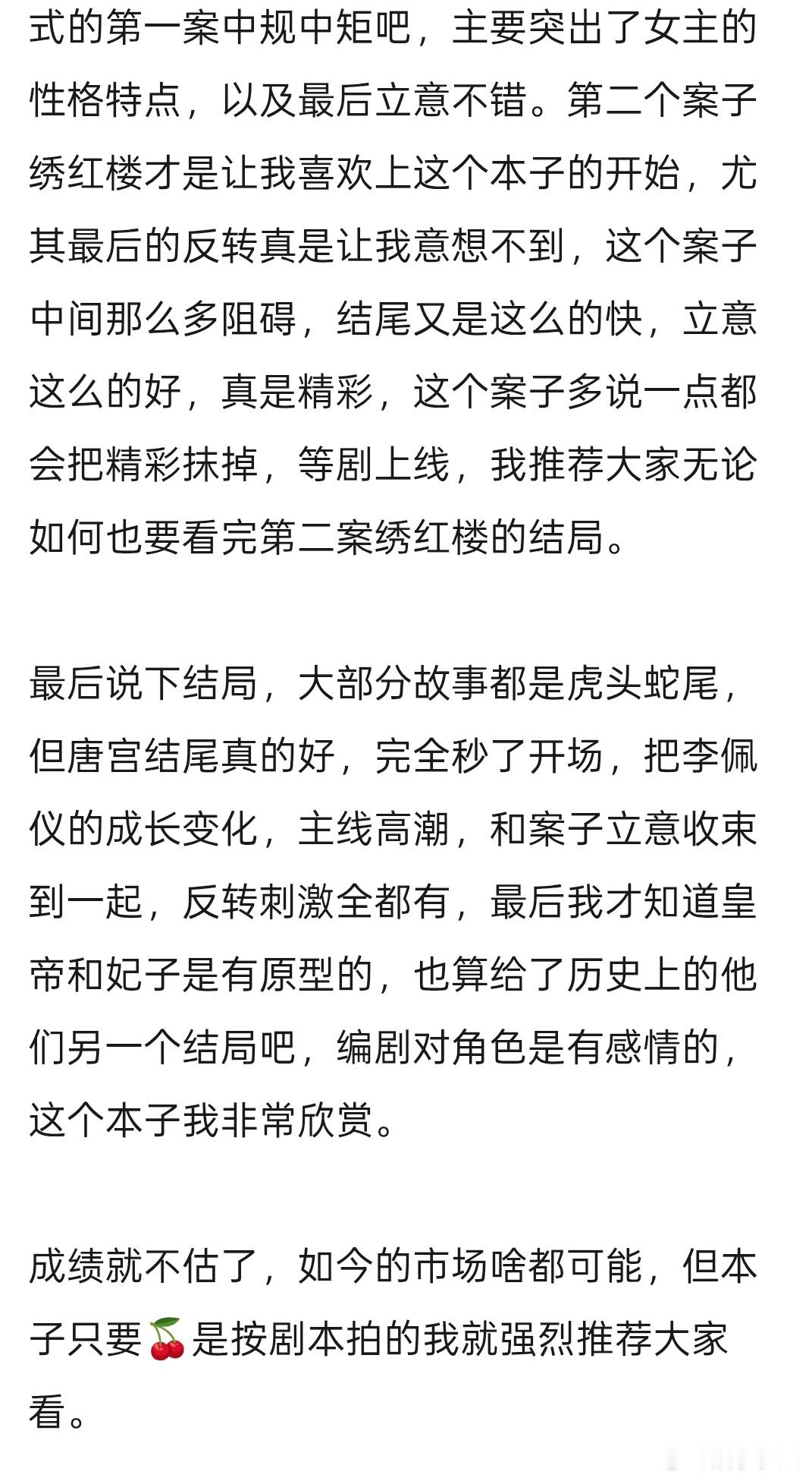 白鹿王星越《唐宫奇案》剧本repo比较纯粹的探案古装,女主智力武力值担当,男主最佳辅助。剧情走女性叙事,落地不悬浮,但探案过程中缺少钩子。cp相关的剧情也不多,大多数都是在破案,粉丝可以放心了