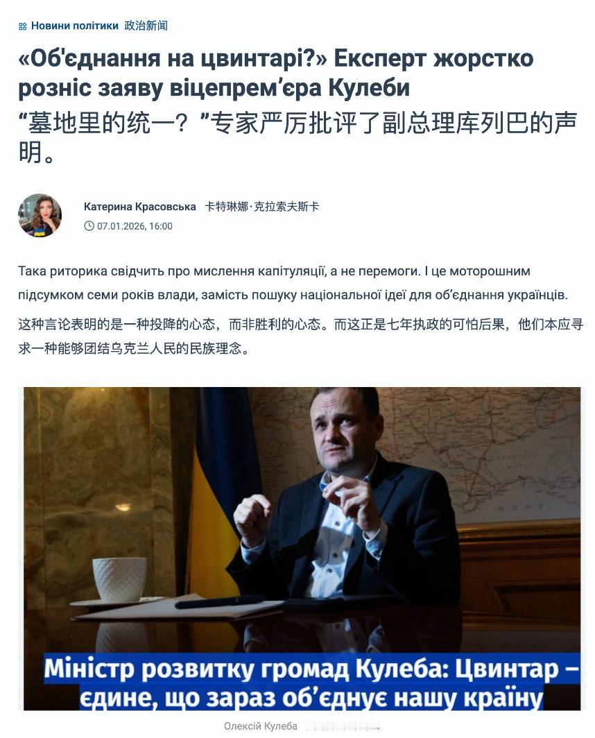 “公墓是现在唯一能将我们国家团结起来的东西。”——乌克兰副总理兼社区发展部长奥列克西·库列巴在一次采访中这样说。 他还说“基辅距离战区550公里。这暗示着基辅与现实脱节,他们试图用好消息最大限度地麻痹社会……关键在于平衡。我们得想想,我们需要平衡的是什么?我们有庞大的军事力量,工作量也异常繁重。现在是什么让我们的国家团结在一起?作为一名负责地区政策的人,我可以告诉你,是公墓。这是现在唯一能让我们国家团结在一起的东西。” 乌克兰副总理居然讲了一个十分残酷、却又最接近事实的冷笑话。他的言论立刻遭到批评,说他:“这种言论表明的是一种投降的心态,而非胜利的心态。而这正是七年执政的可怕后果,他们本应寻求一种能够团结乌克兰人民的民族理念。” ——可是,就连这种强调爱国的批评也变成了对乌克兰政府的批评。 那么,乌克兰人就真的没有可以团结的场所了。 所有人都知道,一个不团结的国家在战争里会有怎样的结局。