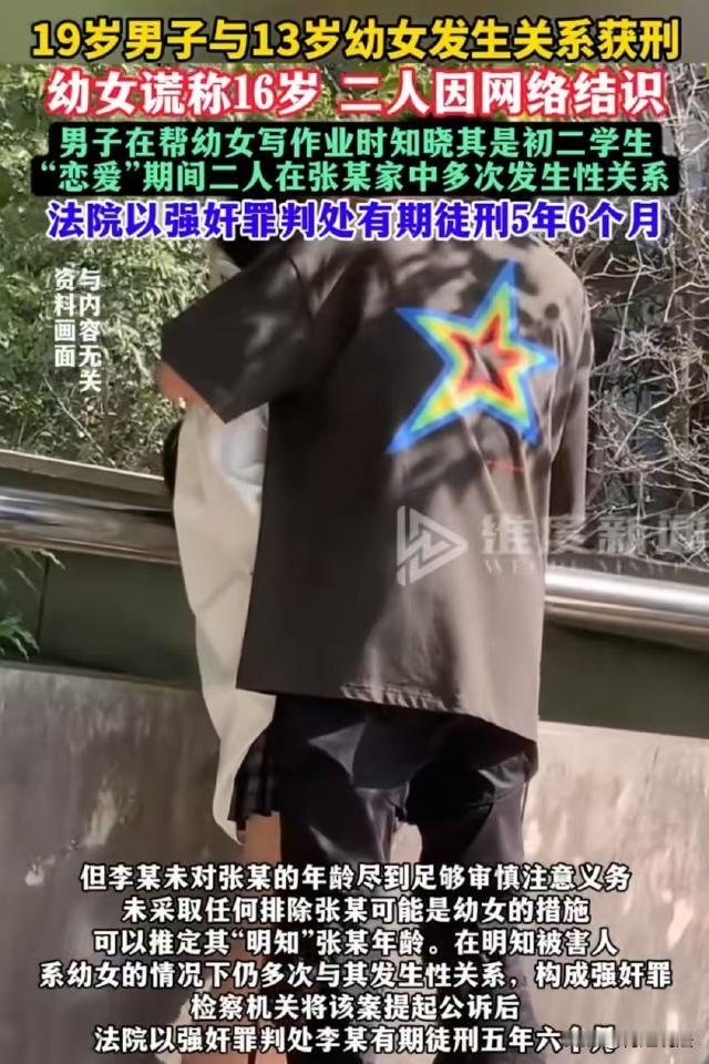 内蒙古,19岁男子李某玩游戏认识了13岁初二女生张某,两人确定了恋爱关系,虽然张某谎称自己16周岁,但是李某给她写作业时,发现她只上初二。恋爱期间,李某和张某多次在张某家里发生过关系。此事案发后,李某因强奸 罪被判处有期徒刑5年6个月。 据包头铁路运输法院、维度新闻等报道,13岁的张某是一名初二女生,父母因忙于工作,平时对她关注较少。 因父母经常早出晚归,就给张某留了一个手机,方便双方联系及张某学习,可没想到,张某竟然迷上了刷视频打游戏。 一次游戏中,张某认识了李某,李某技术精湛,一通操作秀下来,张某崇拜不已。 两人就此认识,李某听张某声音娇憨,询问她多大了,张某怕李某觉她太小不带她玩,谎称自己16岁。 随后,两人不仅结成了游戏CP,还确认了现实中的恋爱关系。 张某学习紧张,但又想和李某玩,于是就让李某帮她写作业,李某帮张某写作业期间,发现她实际是上一名初二学生。 李某并没有就此和张某断开联系,反而和张某感情升温迅速,甚至趁着张某父母不在家,多次去张某家和她见面。 见面后,李某看到张某衣着童真,面容稚嫩,身体也刚刚开始发育,看起来年纪很小。 但是,李某并没有放在心上,也没有向张某求证,而是当做不知道继续和张某保持恋爱关系。 张某只有13岁,心智还不成熟,短暂的相处,竟让她将李某认定为可以托付一生的人。 两人独处过程中,张某和李某偷食了禁果。此后,李某在去张某家找她时,又多次和张某发生了关系。 可很快,张某的父母就发觉了女儿的不对,还在女儿的手机里发现了令他们崩溃的事。 张某的父母立即报了警,李某被传唤到案。 到案后,李某如实供述了和张某认识并交往的全过程,但是,李某拒不承认强 奸。 李某辩解称,张某告诉自己她16岁,自己并不知道她的真实年龄。 自己和张某是正常恋爱,虽然和张某发生过多次关系,但都是在张某同意的情况下进行的,自己并没有强迫她。 因此,自己并不算强 奸。 对于这种说法,张某也进行了证实,但李某还是被检方以强奸罪提起了公诉。 在李某和张某看来,他们俩是正常恋爱,发生亲密关系,也是你情我愿的事,为什么李某仍旧会被认定为强 奸呢? 这是因为,未成年女孩身心发育尚未成熟,缺乏对性 行为的正确认识,和有效的同意能力,即使其在表面上表现出自愿,这种自愿在法律上也是无效的。 《刑法》第二百三十六条第二款规定,奸 淫不满十四周岁的幼 女的,以 强 奸 论,从重处罚。 这一规定,是为了对幼 女这一特殊群体实行绝对保护。 虽然张某向李某谎称自己16岁,但李某在与张某的交往过程中,有足够的信息表明张某是不满十四周岁的幼女。 李某帮张某写作业时发现她是初二学生,见面时,张某衣着、面容、身体发育状况等情况,都应当使李某意识到张某可能是幼 女。 依据《最高法、最高检关于依法惩治性侵害未成年人犯罪的意见》第十九条规定,知道或者应当知道对方是不满十四周岁的幼 女,而实施 奸 淫 等 性 侵害行为的,应当认定行为人“明知”对方是幼 女。 案发时李某已经19岁,作为具有一定社会经验的成年人,李某未对张某的年龄尽到足够审慎注意义务,相处过程中,也未采取任何排除张某可能是幼 女的措施。 因此,可以推定李某明知张某年龄。李某在明知张某是幼 女的情况下,仍多次与其发生了关系,符合强 奸 罪的构成要件。 经审理认为,根据《刑法》第二百三十六条规定,李某的行为不属于强 奸 罪中的严重情节。 综合考虑李某的犯罪事实、情节和社会危害程度,最终以强奸罪判处李某有期徒刑五年六个月。