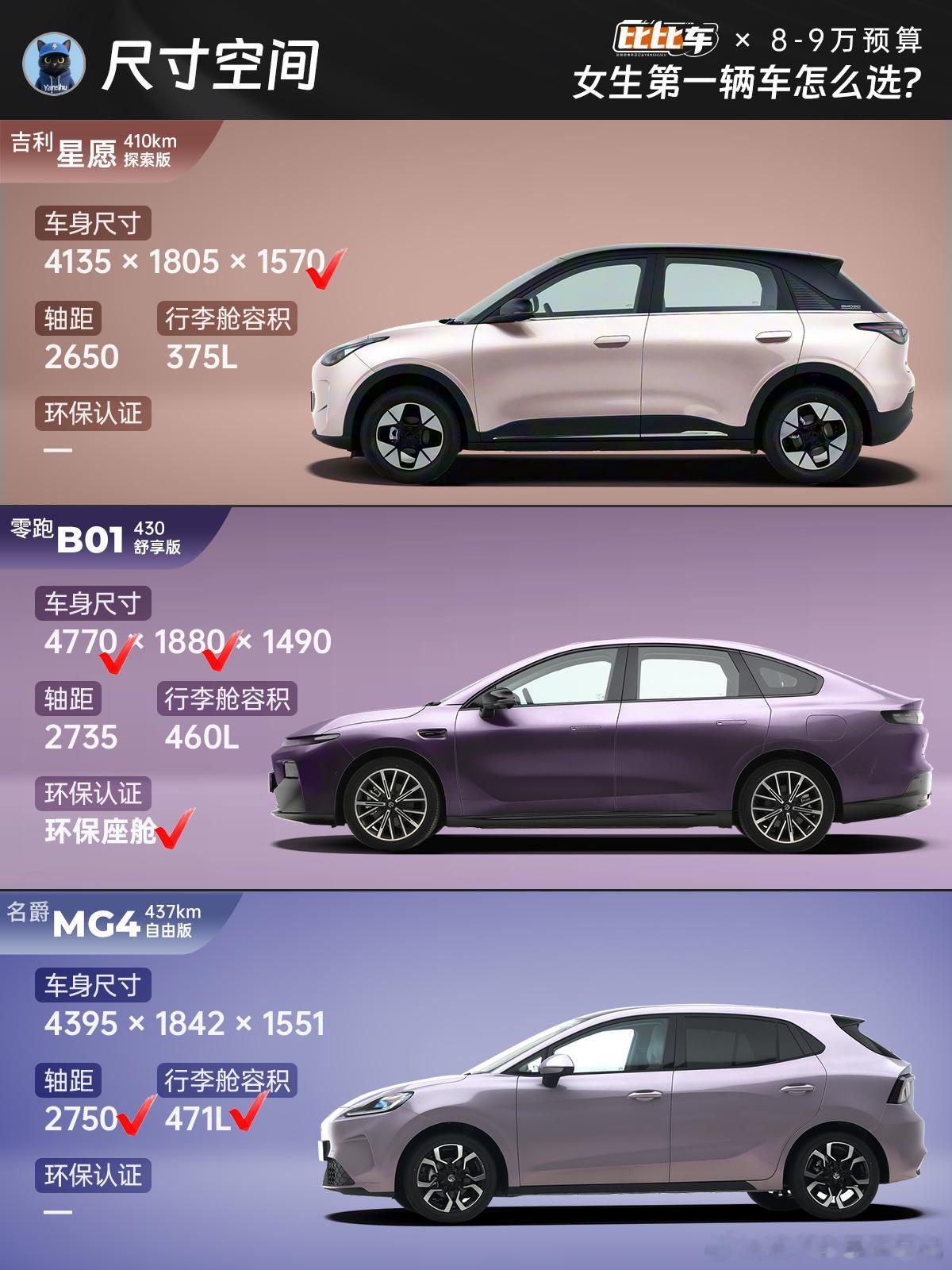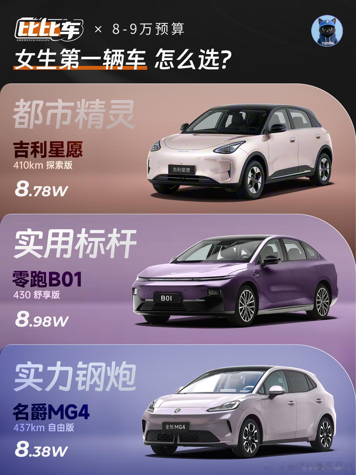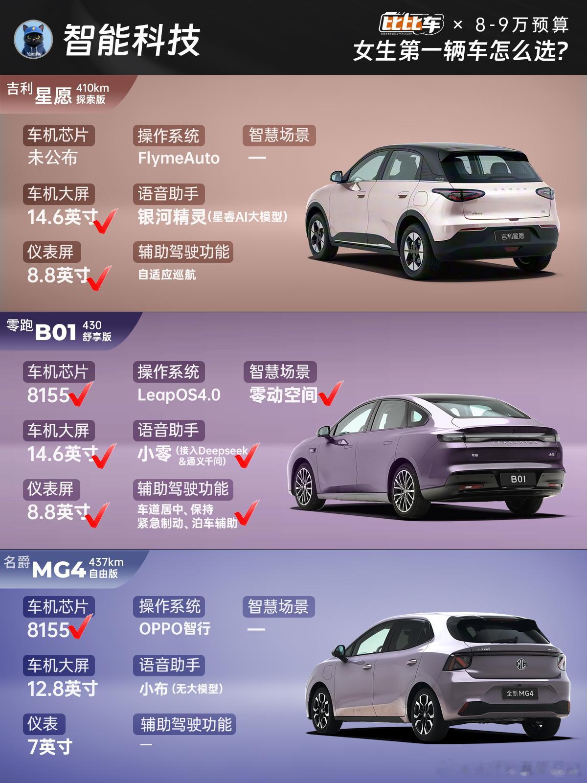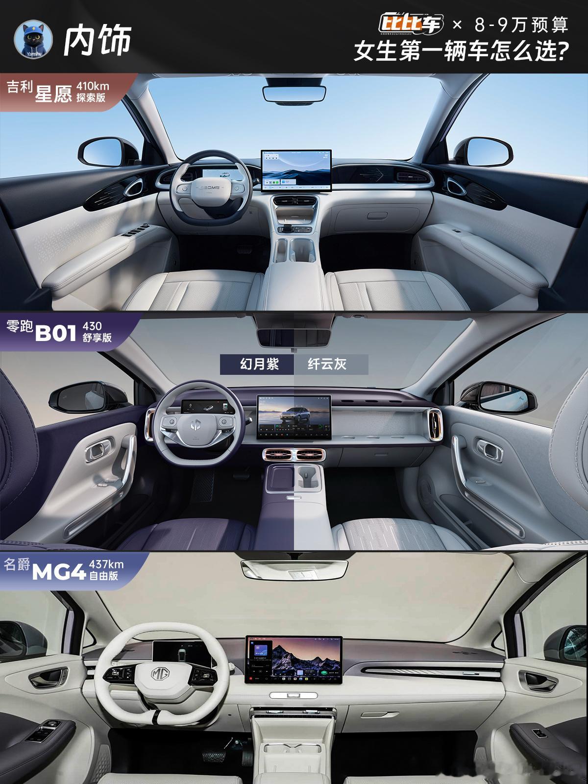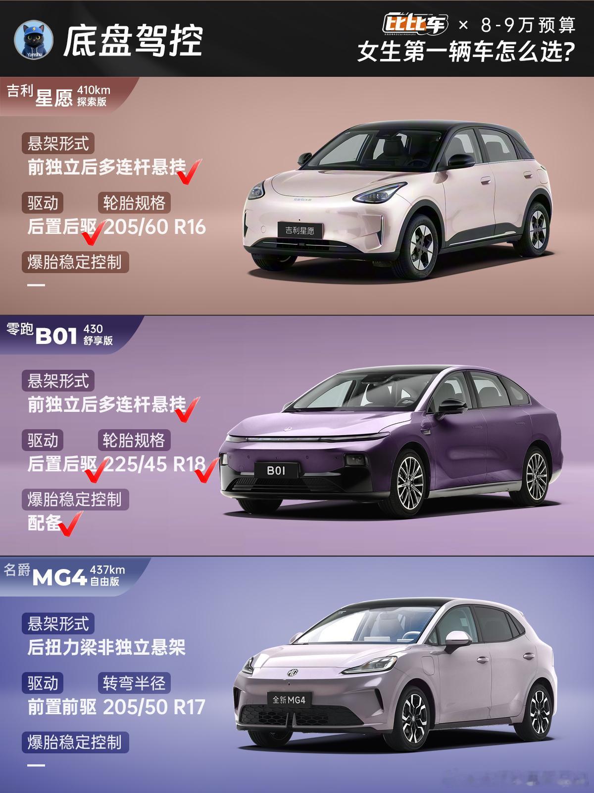 预算8-9万,女生第一台车怎么选?8到9万的预算买纯电家用车,这个价位现在很受关注。今天来聊聊三款热门车型:零跑B01 430舒享版、吉利星愿 410km探索版,以及名爵MG4 437km自由版尺寸零跑B01 430舒享版车长4770,是标准的中型尺寸,后排腿部空间宽裕,适合家庭。吉利星愿 410km探索版车长4135,A级小车,城市驾驶和停车灵活。名爵MG4 437km自由版,车长4395,小钢炮造型运动紧凑操控零跑B01 430舒享版是后置后驱,配后前独立后多连杆悬挂,中欧底盘团队联合调校,兼顾支撑性和后排舒适性。轮胎225宽度,18寸轮毂,搭配后驱冬季和高速行驶安全、不飘。吉利星愿 410km探索版也是后置后驱+后多连杆独立悬挂,这在A级小车中比较难得。名爵MG4 437km自由版是前置前驱,后悬挂为扭力梁非独立悬挂,调校偏运动三电续航零跑B01 430舒享版CLTC续航430公里,电池43.9kWh ,电机100kW。吉利星愿 410km探索版续航410公里,电池40.16kWh,电机85kW。名爵MG4 437km自由版续航437公里 ,电池42.8kWh,电机120kW。三车续航动力都满足日常通勤。零跑B01官方快充18min从30%到80%,其他两款在20min左右智能座舱零跑B01 430舒享版是8.8英寸仪表+14.6英寸中控屏,内饰88%软包覆盖率,采用“零甲醛”环保座舱,触感和科技感不错。吉利星愿 410km探索版也配备了14.6英寸中控大屏,配备电尾门。名爵MG4 437km自由版是7英寸仪表和12.8英寸中控屏,配备全景天幕。三款硬件在同级中处于头部。零跑B01搭载了DeepSeek和通义双AI大模型,MG4联合OPPO定制车机系统,各有侧重辅助驾驶零跑B01 430舒享版支持L2级功能,有全速自适应巡航、车道居中和保持、前车驶离提醒,适合高速和堵车路况;支持泊车辅助,对女生和新手很友好。吉利星愿 410km探索版也支持全速自适应巡航,提供基础辅助驾驶能力。名爵MG4 437km自由版未配备L2级辅助驾驶功能总体来看,这三款车都很有竞争力,但侧重点不同零跑B01 430舒享版在空间、底盘和智能化方面都比较均衡吉利星愿 410km探索版是典型的城市精灵,灵活好开名爵MG4 437km自由版在动力和天幕等舒适配置上更吸引人希望对你有帮助,欢迎在评论区聊聊你的看法~我是只讲干货的炎叔。带你秒懂电车。零跑B01吉利星愿 名爵MG4