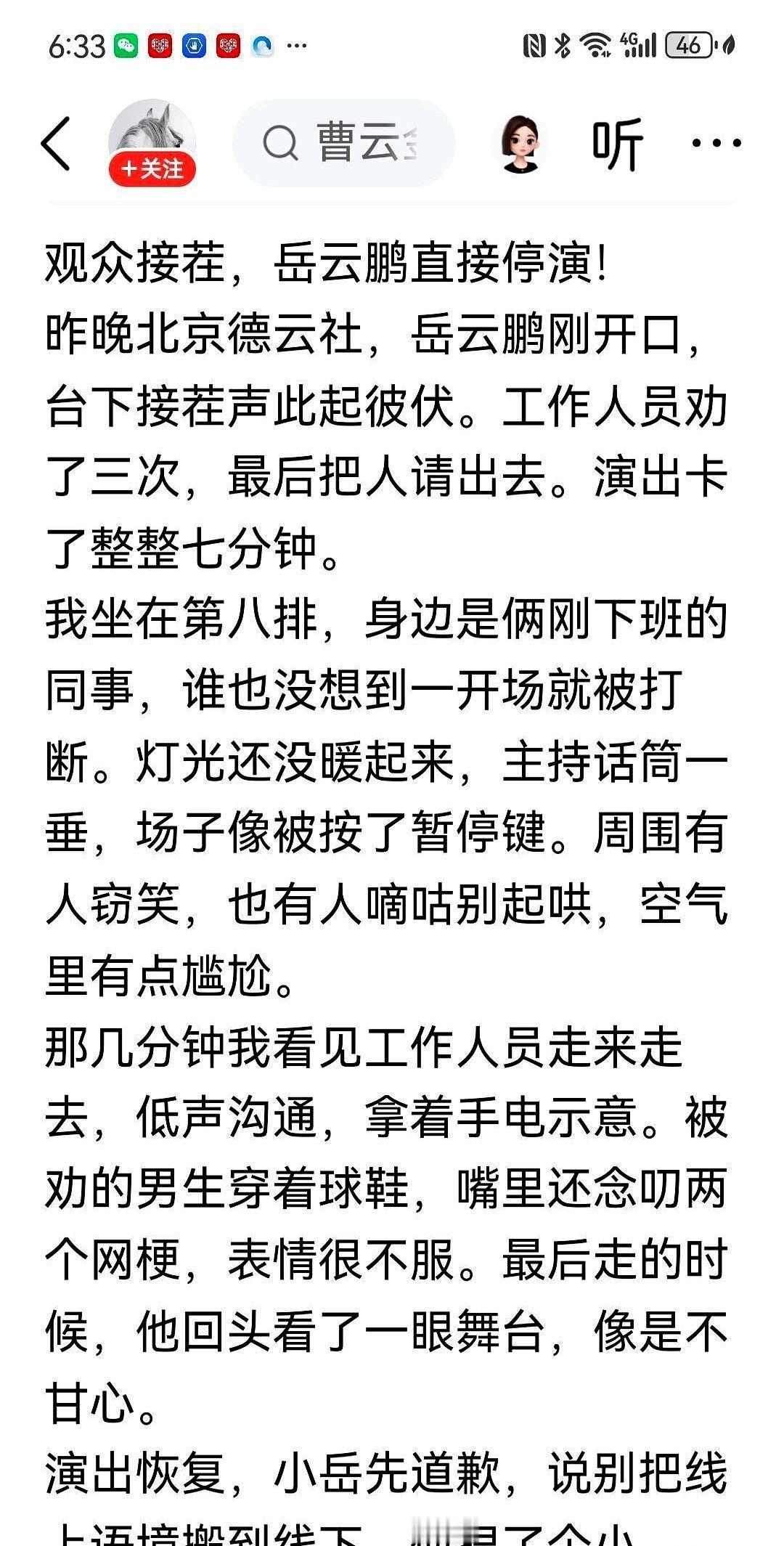 岳云鹏死死盯着台下一个人,足足七分钟。 就因为那哥们儿接了句茬。 一下子,整个场子都凉了。 很多人不理解,说相声不就是图个热闹,接句话怎么了?天津小园子不都这么玩儿吗? 哎,哥们儿,这你真就不懂了。 天津那叫“玩儿”,你来我往,跟打乒乓球似的,演员就盼着你搭茬,好借着你的话翻出新包袱。那是街头巷尾长出来的生命力,主打一个随心所欲,热气腾腾。 但现在德云社这个,是“活儿”。 是一台严丝合缝,被精心计算过的工业产品。 哪个点该停顿,哪个点该出包袱,哪个点台下该爆笑鼓掌,都是设计好的。你以为你听的是即兴,其实是人家排练了无数遍的精准剧本。 你突然喊一嗓子,以为是抖机灵,是捧哏。 不,你是把人家齿轮里扔了根棍子,整个生产线都得停下来。 那七分钟的沉默,不是尴尬,是小岳在用眼神告诉全场:这是我的场子,得按我的规矩来。 你以为你抖了个机灵,其实是砸了人家的饭碗。 说白了,看演出就跟去别人家做客一样。 什么时候该喝彩,什么时候该安静坐着,是一种最基本的教养。 给别人留舞台,也是给自己留体面。