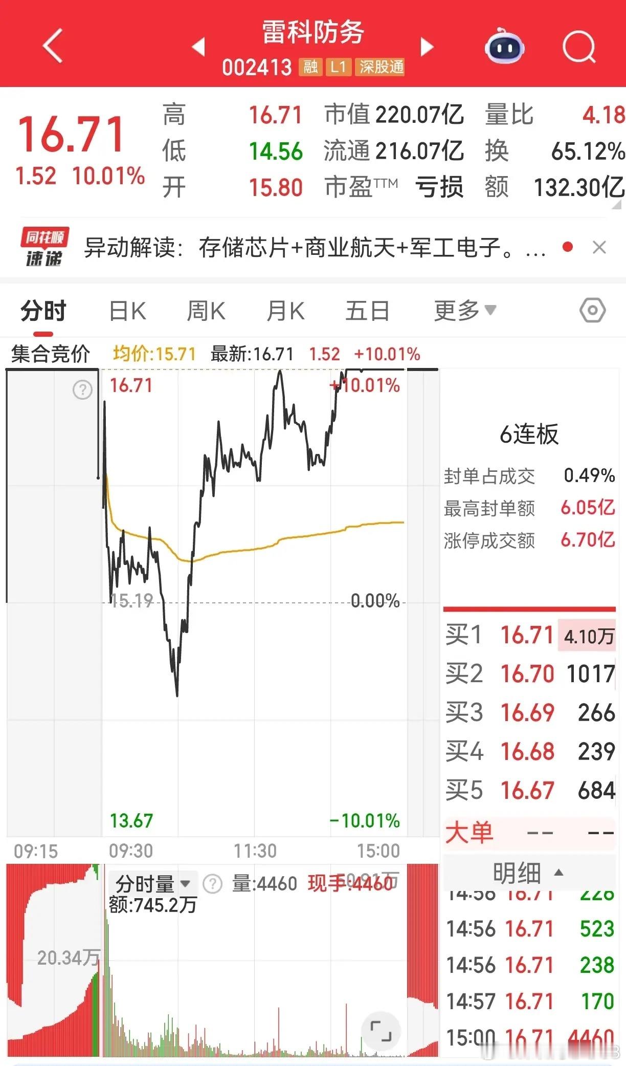 极尽炒作之能事,繁华落尽必悲凉。——雷科防务走势的悲与欢。雷科防务,我是11月24日进去做过第一个三连板后出来的。后面的几波行情,由于认知有限一直没再跟进。最近此轮行情是在12月25日后开始的,当时由于资金没能腾出空位,错过了第一个涨停板,后面一字板之类的就不再考虑,只是观赏了,此股走位确实蛮牛的。行至今日,雷科防务已经六连板了,关键的问题是,放量,65%的换手率,用疯狂来形容一点不为过。想想看,都是什么人在卖什么人在买。现在各种信息满天飞,散户通过网络获知大佬游资建仓品种,纷纷效仿,也能分到一杯羹。参与的同时一定要多留个心眼,别盲目跟风到天老地荒,人家都跑了,你还在风中凌乱,雨中痛哭。真正的走得较远的大牛哥一般都是适当的放量,不信去看看上纬新材和天普股份。一旦超过50%换手,多是量化与游资参与的无厘头炒作。有人说这是情绪,我不懂,什么是情绪,无非就是人气热闹,就像哄抢物品一样,看到别人买,自己恨不得都买了,不买就怕吃亏,实际上就是没有占到便宜就觉得自己吃亏了。合理的有实质性消息的品种,往往是不需要放天量去拉抬股价的。放天量,一定要谨慎谨慎再谨慎。