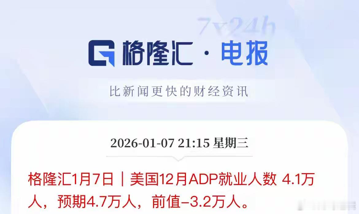 出乎意料之外强,美国12月“小非农”低于预期,但较前值大幅回升刚刚发布美国12月小非农ADP就业人数录得4.1万人,市场预估是4.7万人,前值-3.4万人。