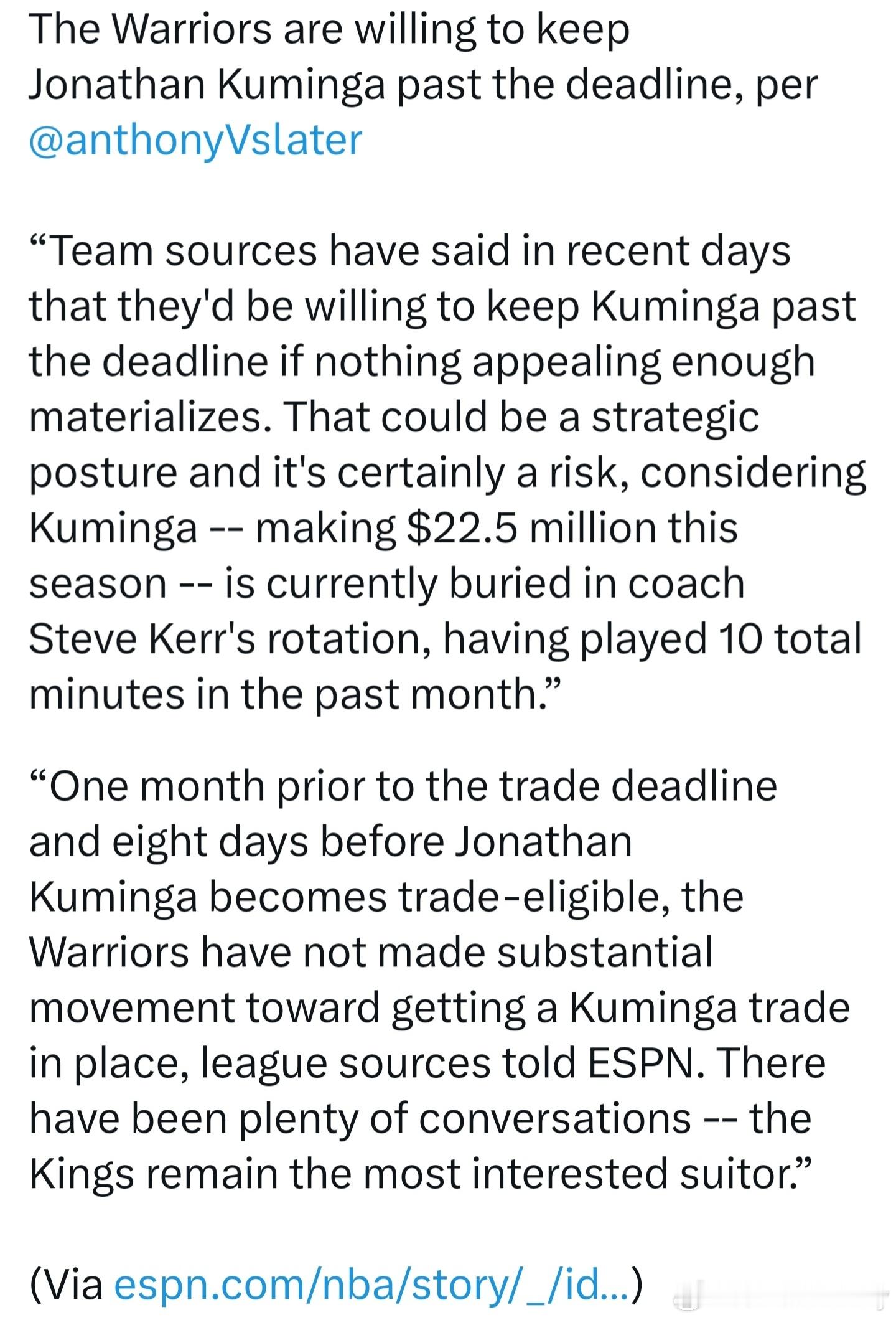 ??何时结束??Anthony Slater:勇士愿意在交易截止日后继续留下库明加球队消息人士表示,若无足够吸引人的交易出现,勇士会继续留下库明加。这可能是一种战略,但考虑到库明加年薪高达2250万,且他目前不在科尔轮换中,过去一个月仅打了不到十分钟,这无疑是一种冒险。此外,国王是对库明加最感兴趣的球队,距离能交易库明加还有一个星期,尽管双方进行了多次对话,但仍未取得实质性进展。