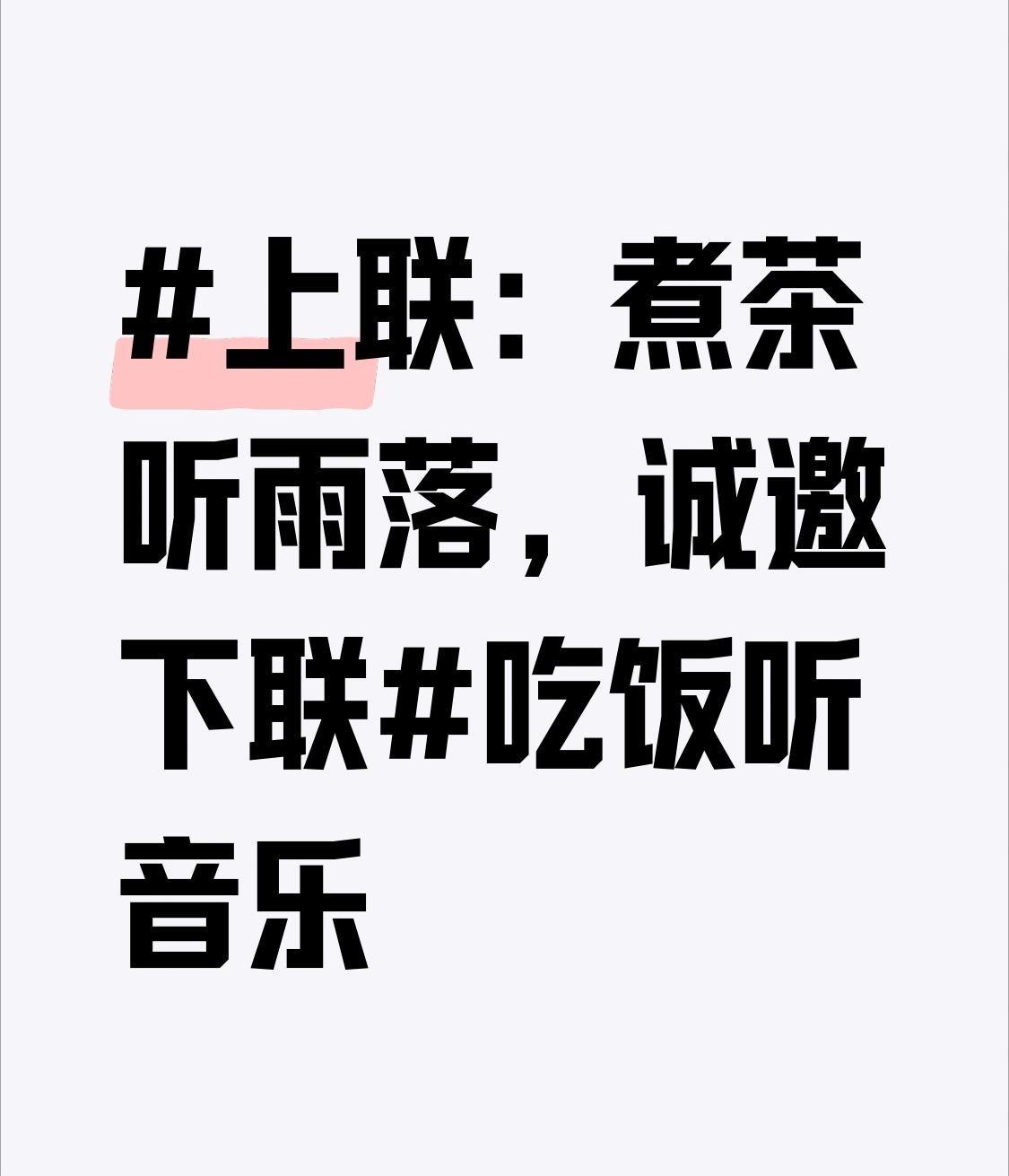 上联:煮茶听雨落,诚邀下联吃饭听音乐